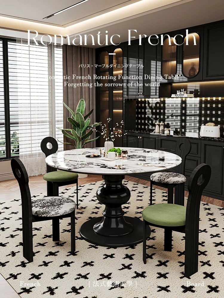 フランス風ヴィンテージ・ブルガリ黒大理石ラウンドダイニングテーブル - 高級感あふれる実木製のレトロスタイル、あなたの家に上質な食卓を。