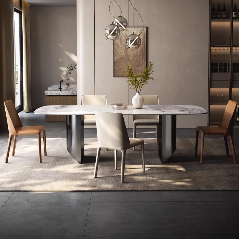 パンドラの岩板ダイニングテーブル&チェアセット - モダンでシンプルなデザイン、軽やかなラグジュアリーを感じる長方形イタリアンテーブル。狭い空間にもぴったりのスタイリッシュな選択!