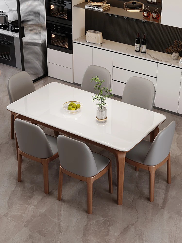 長方形の岩板ダイニングテーブル - ラグジュアリー感溢れる大理石デザイン!家族や友人との食事にぴったりなコンパクトサイズ。シンプルでモダンな木製チェアとのセットで、小さなお部屋にも最適!
