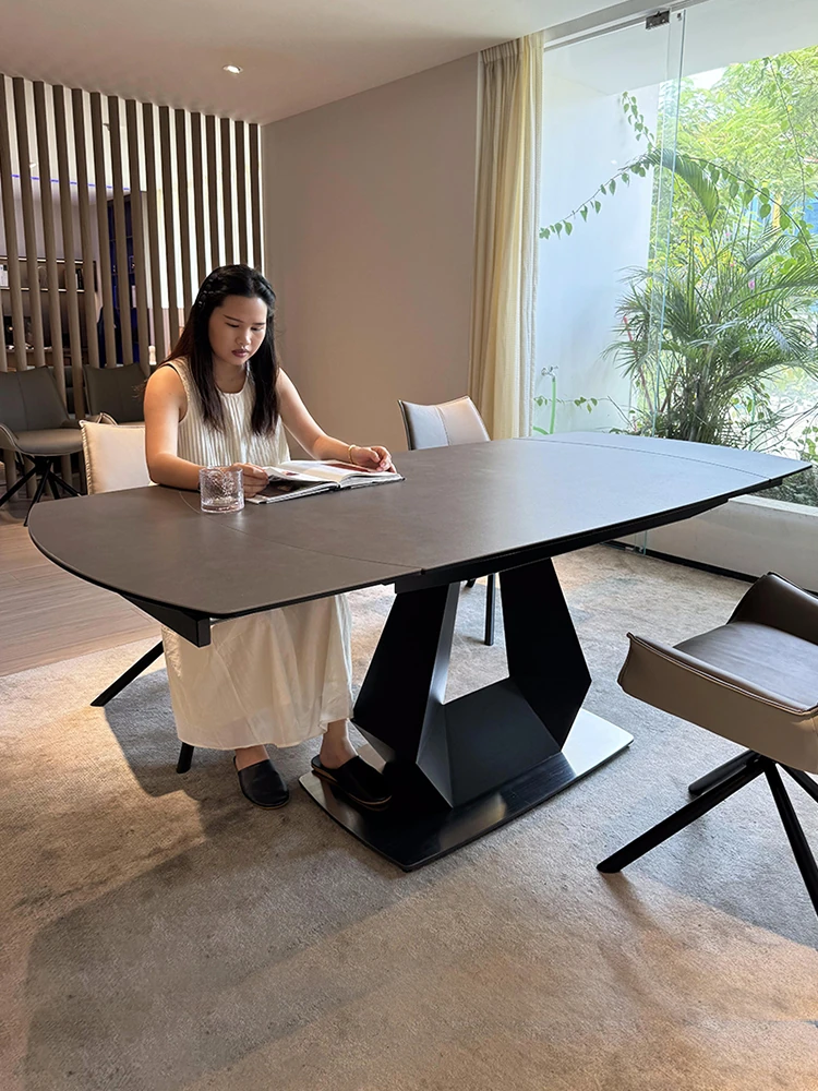 Compact Italian Minimalist 3mm Expandable Stone Composite Dining Table with Modern Saddle Leather Chairs - Perfect for Small Spaces!