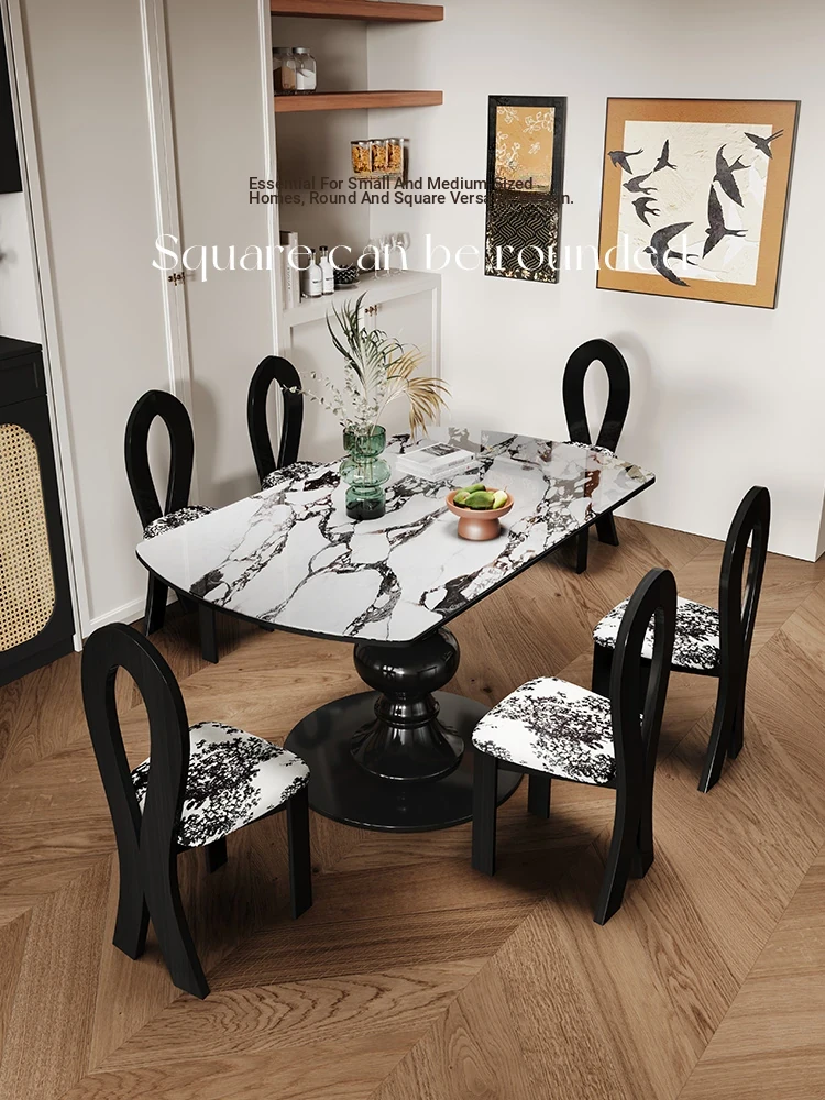 2025 New French Vintage Retractable Carbon Steel Italian Imported Calacatta Stone Dining Table and Chair Set - Elegant and Durable Design for Stylish Dining Experience