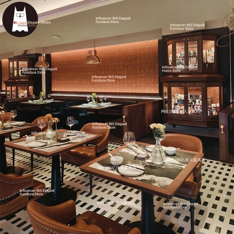 French-Style Solid Wood Marble Small Square Dining Table Set for Restaurants, Cafés, and Bars – Elegant Rock Plate Dining Table with Chair Combination