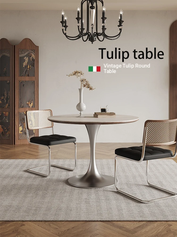 Aoloma Tulip Round Table Set - Vintage-Style Round Dining Table with Natural Stone Slab for Small Spaces - Perfect for Home Dining and Cozy Gatherings