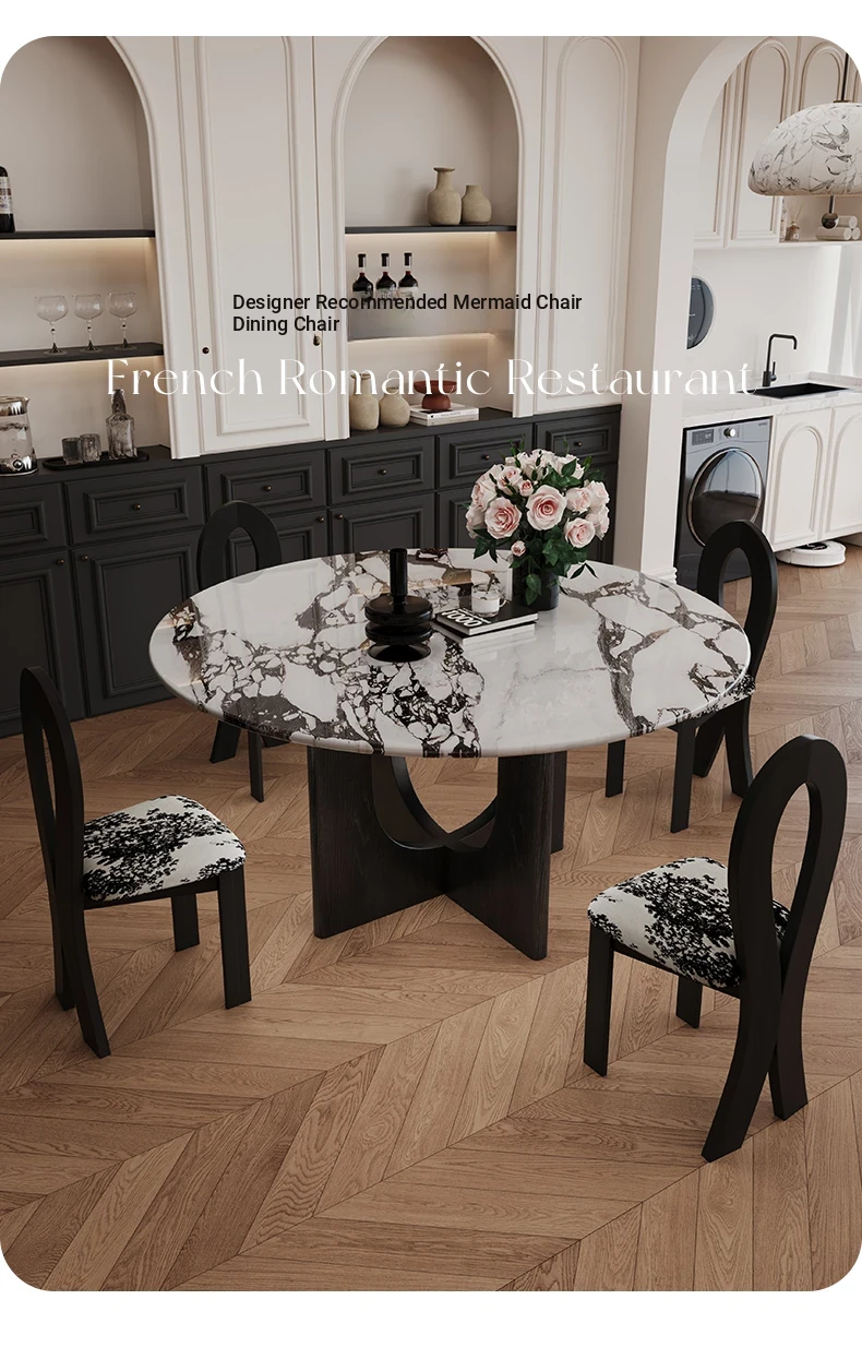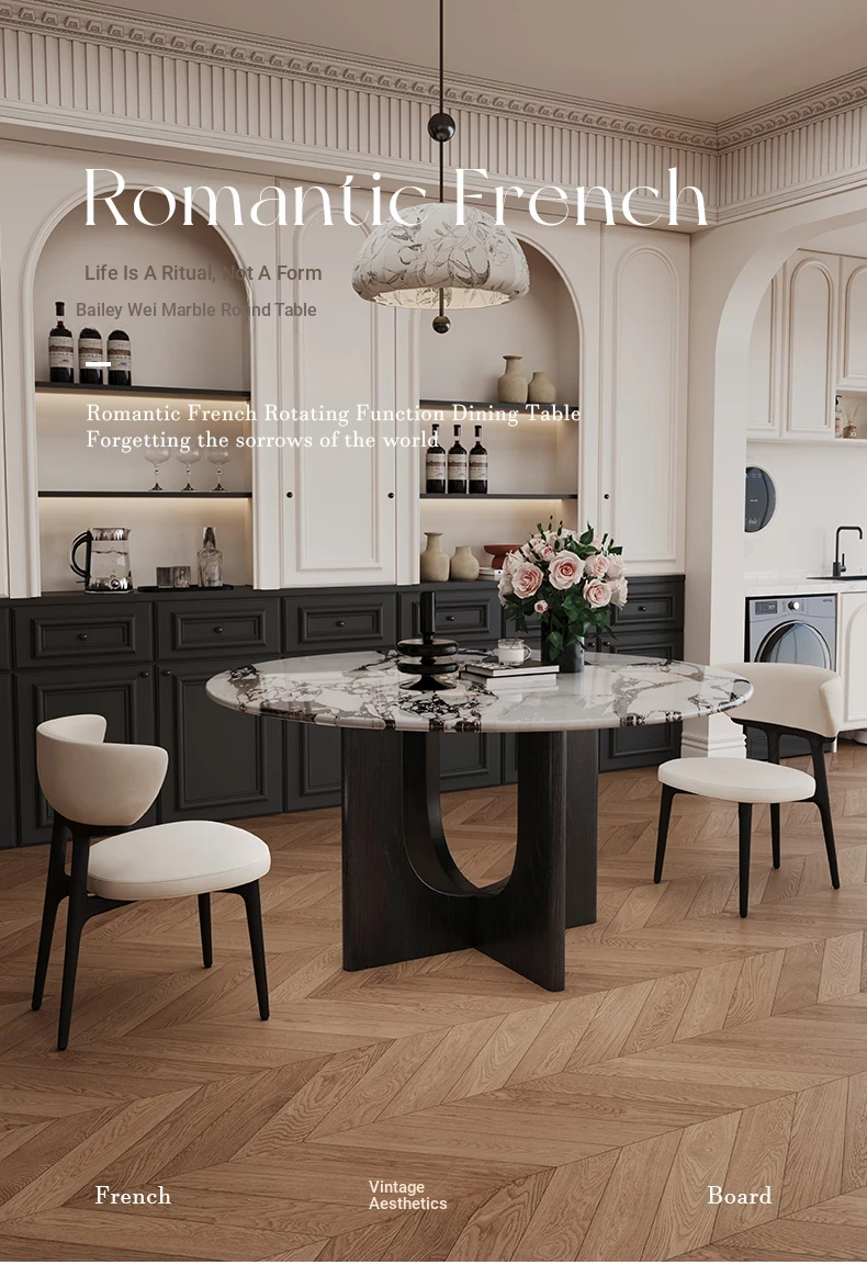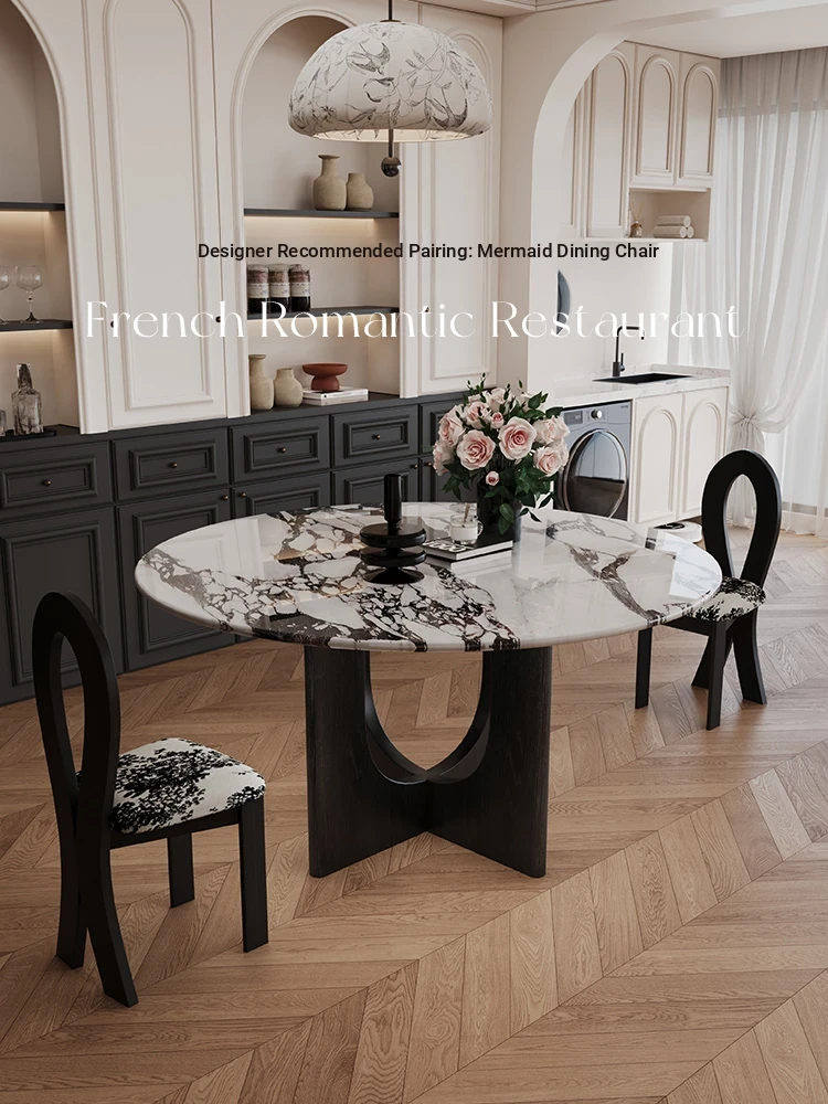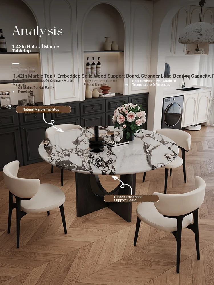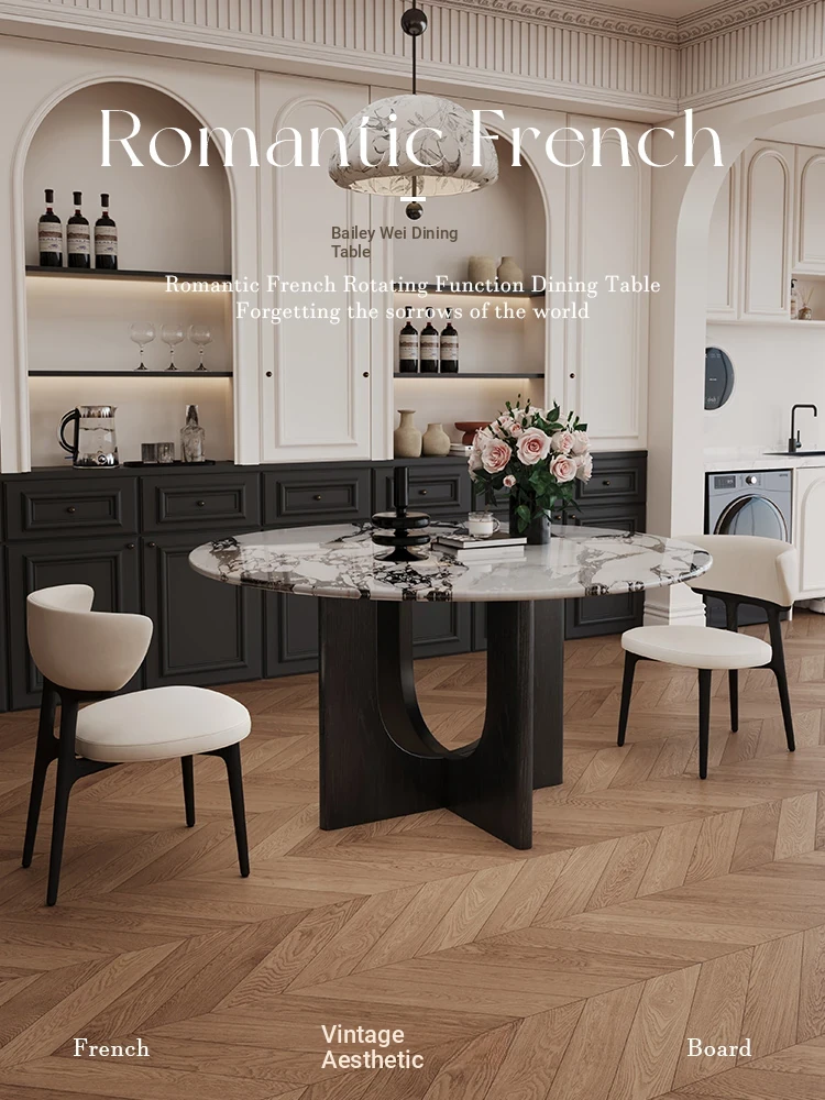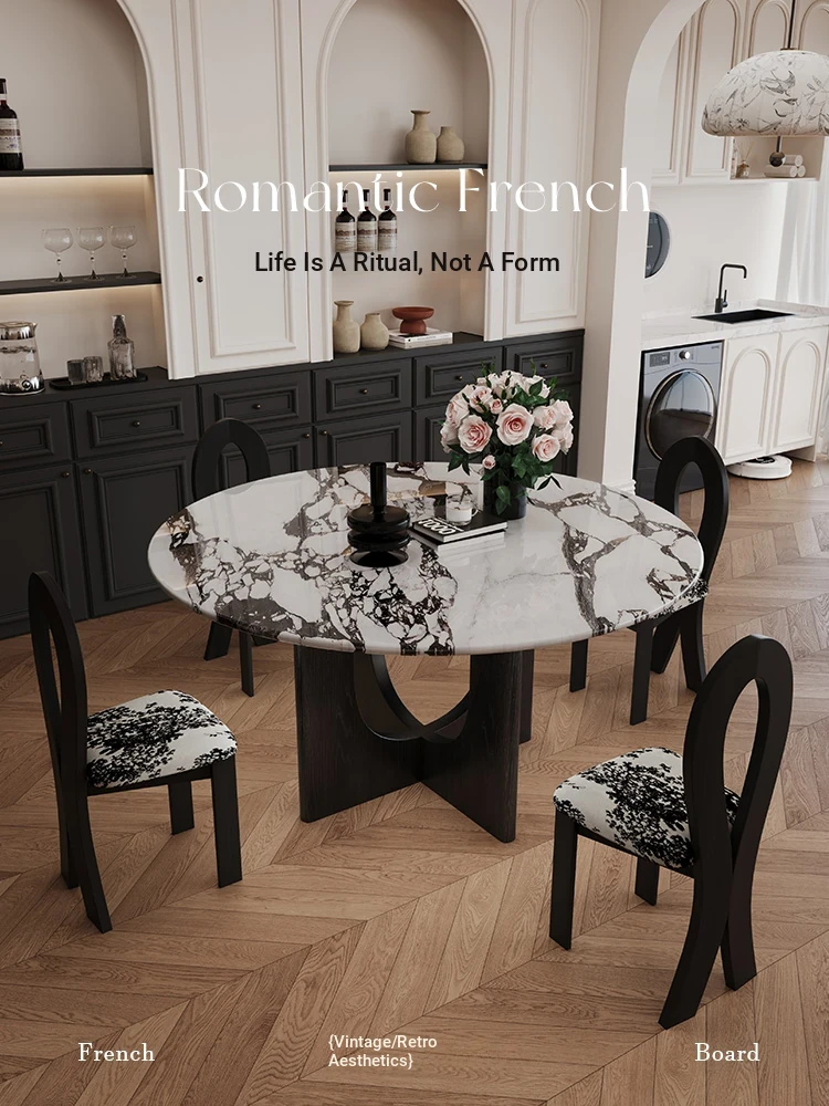 2025 New Vintage French Solid Wood Round Dining Table with Luxury Bulgari Marble - Elegant Home Dining Table Set