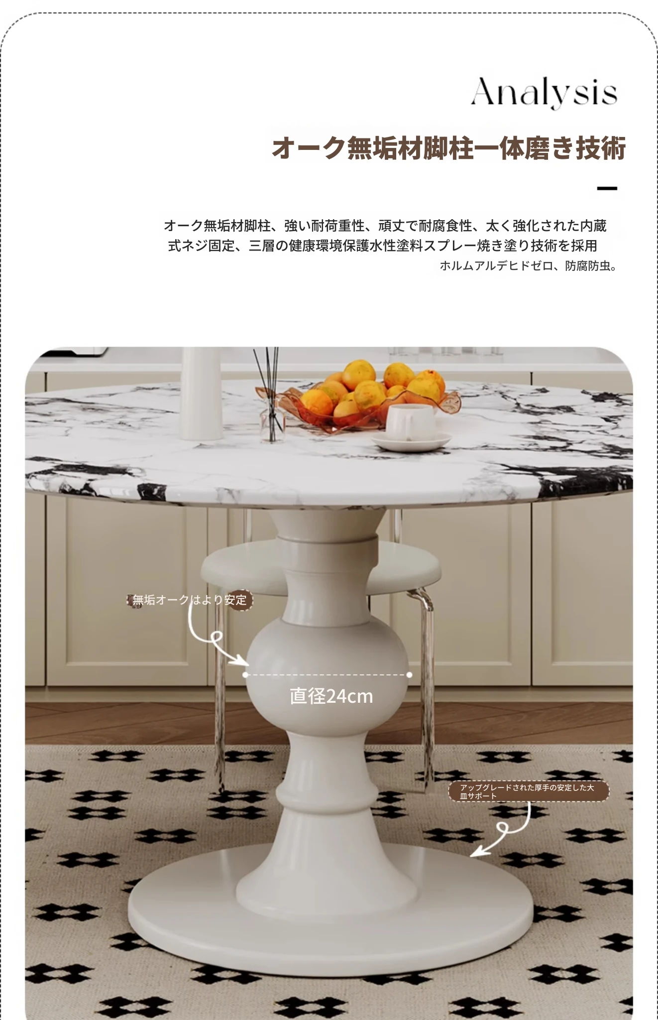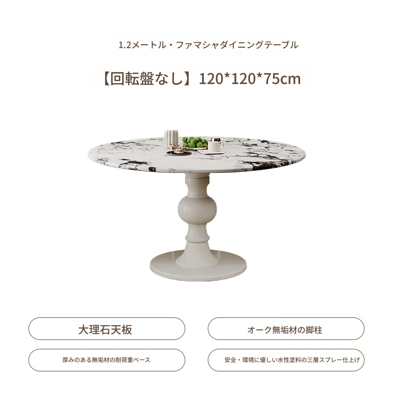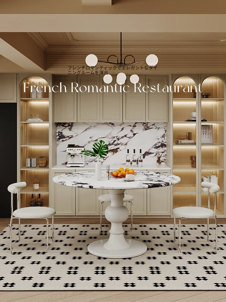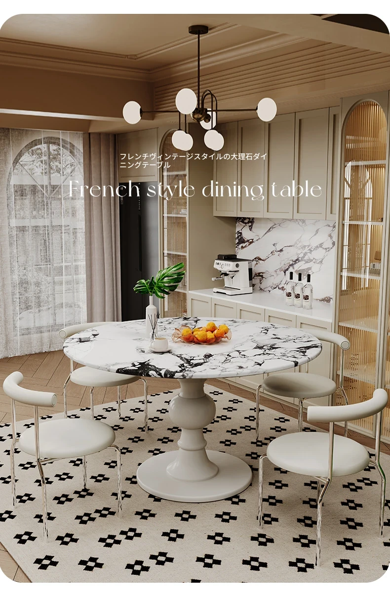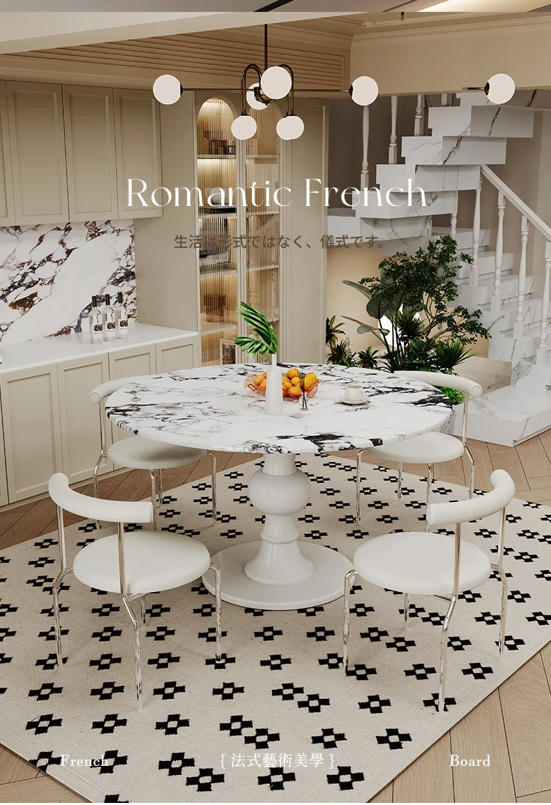 2025年新作!フランス風クリーム仕立ての丸型ボッテガ・ヴェネタ大理石ダイニングテーブル。小さなお部屋にもぴったりな実木ホワイトラウンドテーブルで、洗練された空間を演出!