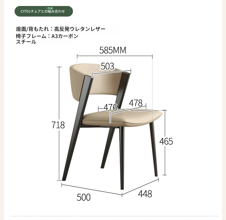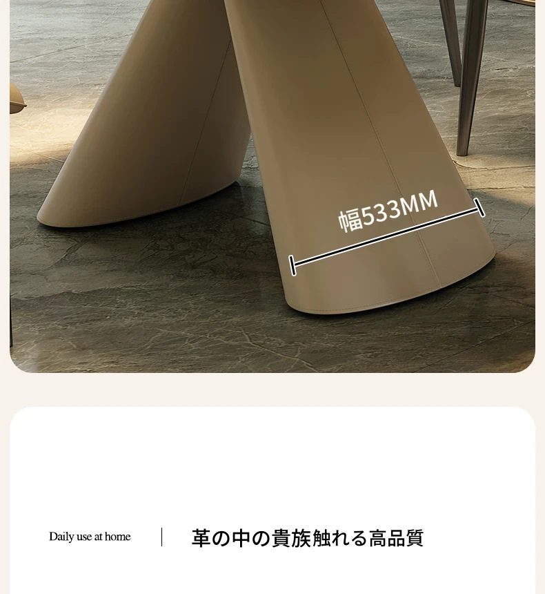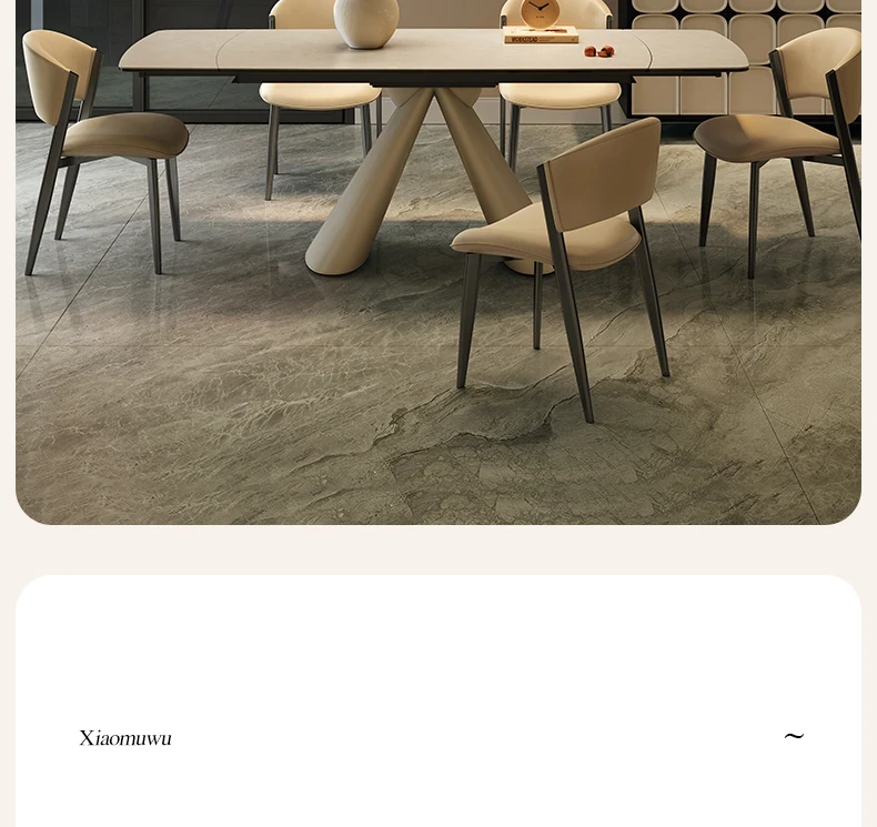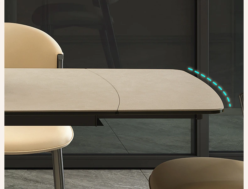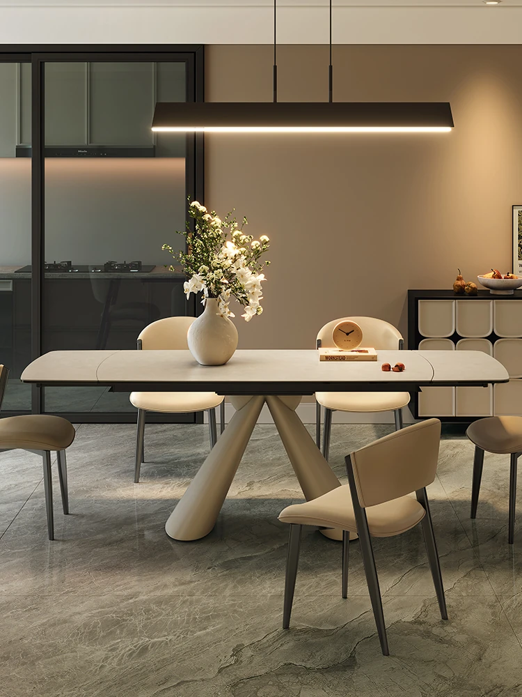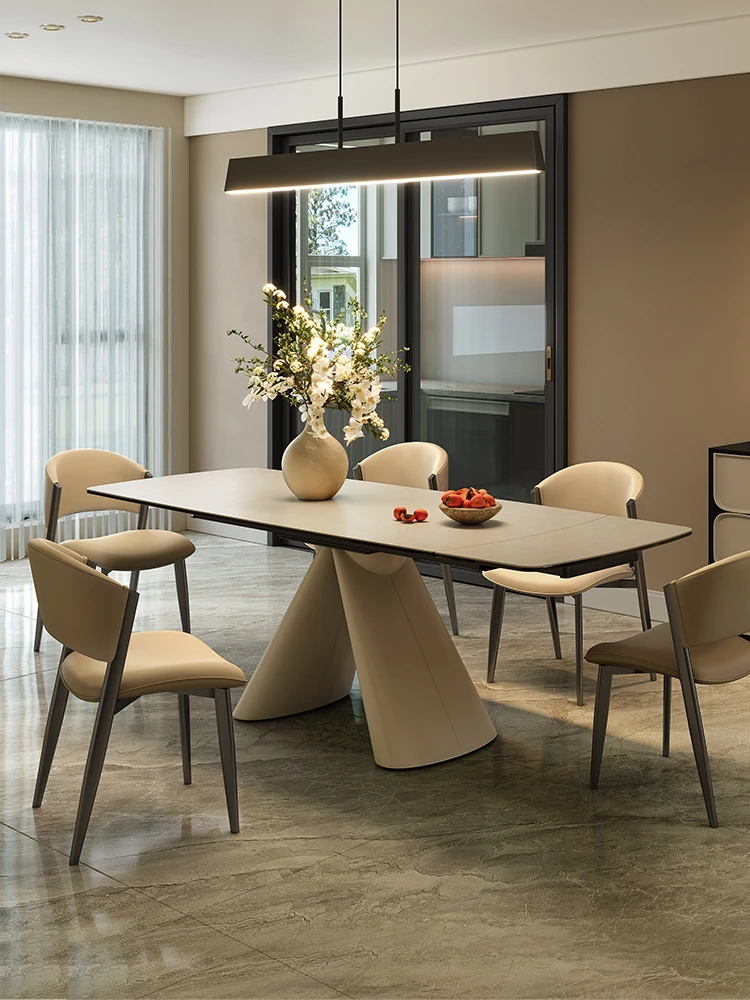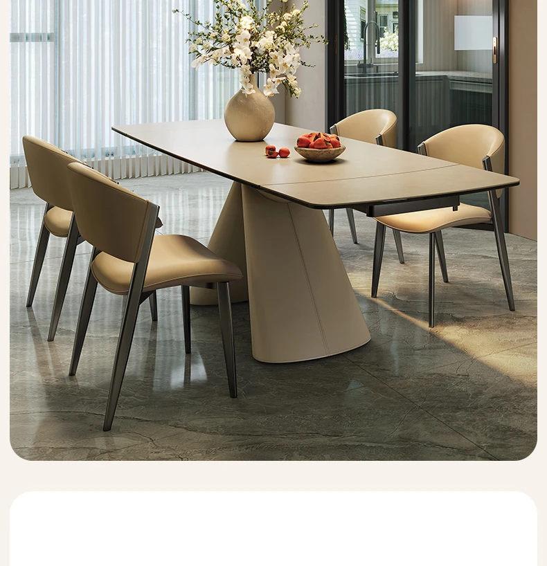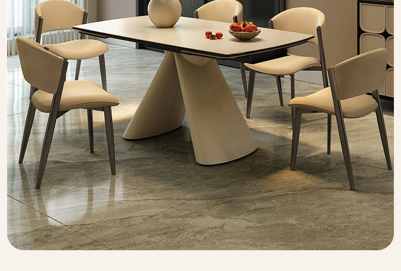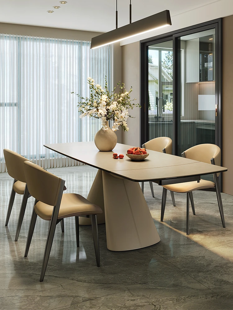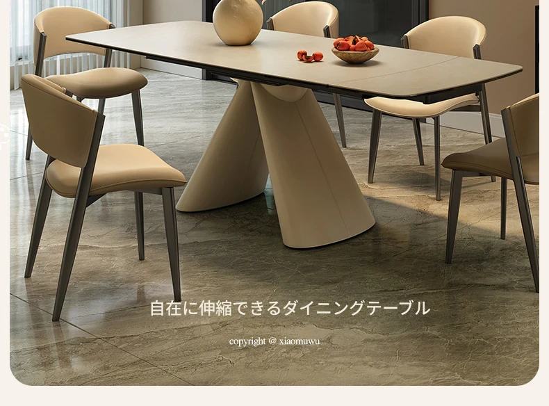 小さな空間に最適!イタリアンミニマリズムの3mm伸縮可能な洞石岩板ダイニングテーブルとモダンなサドルレザーのダイニングチェアセット