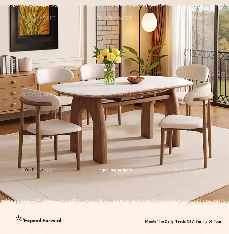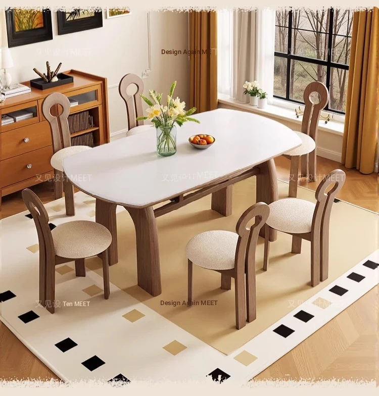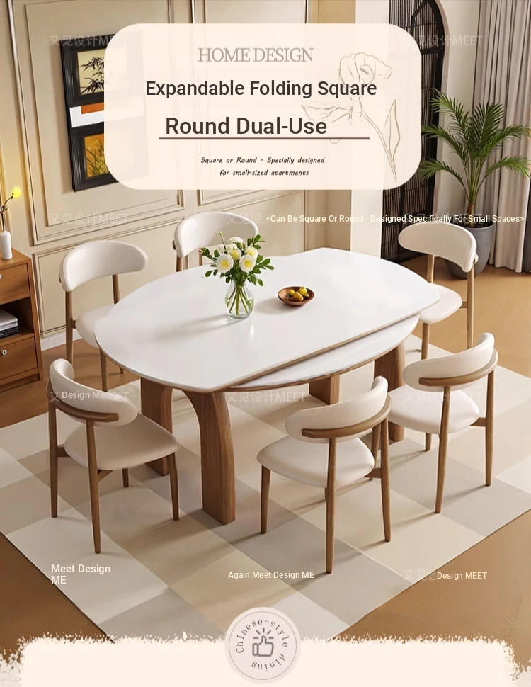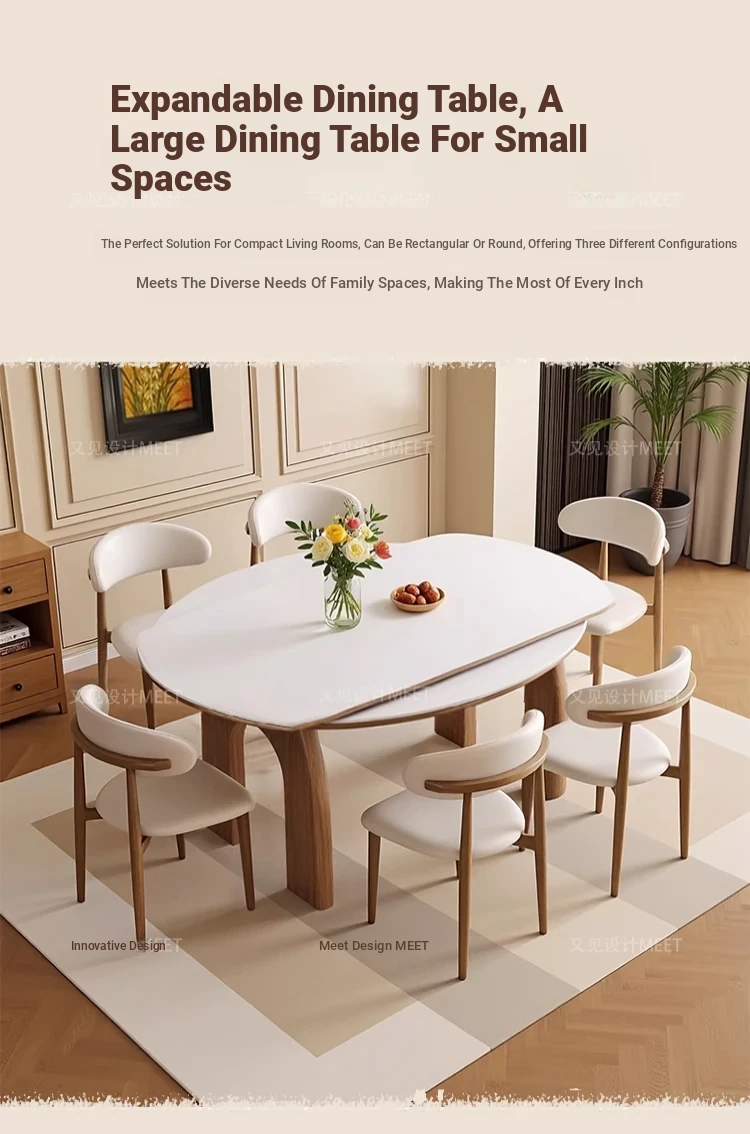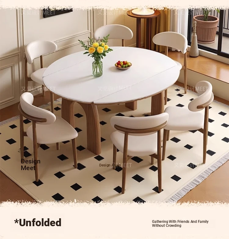 伸縮可能な無垢材ロックボードダイニングテーブルセット|フレンチヴィンテージ風|小型リビングに最適な調整可能な円形ダイニングテーブル