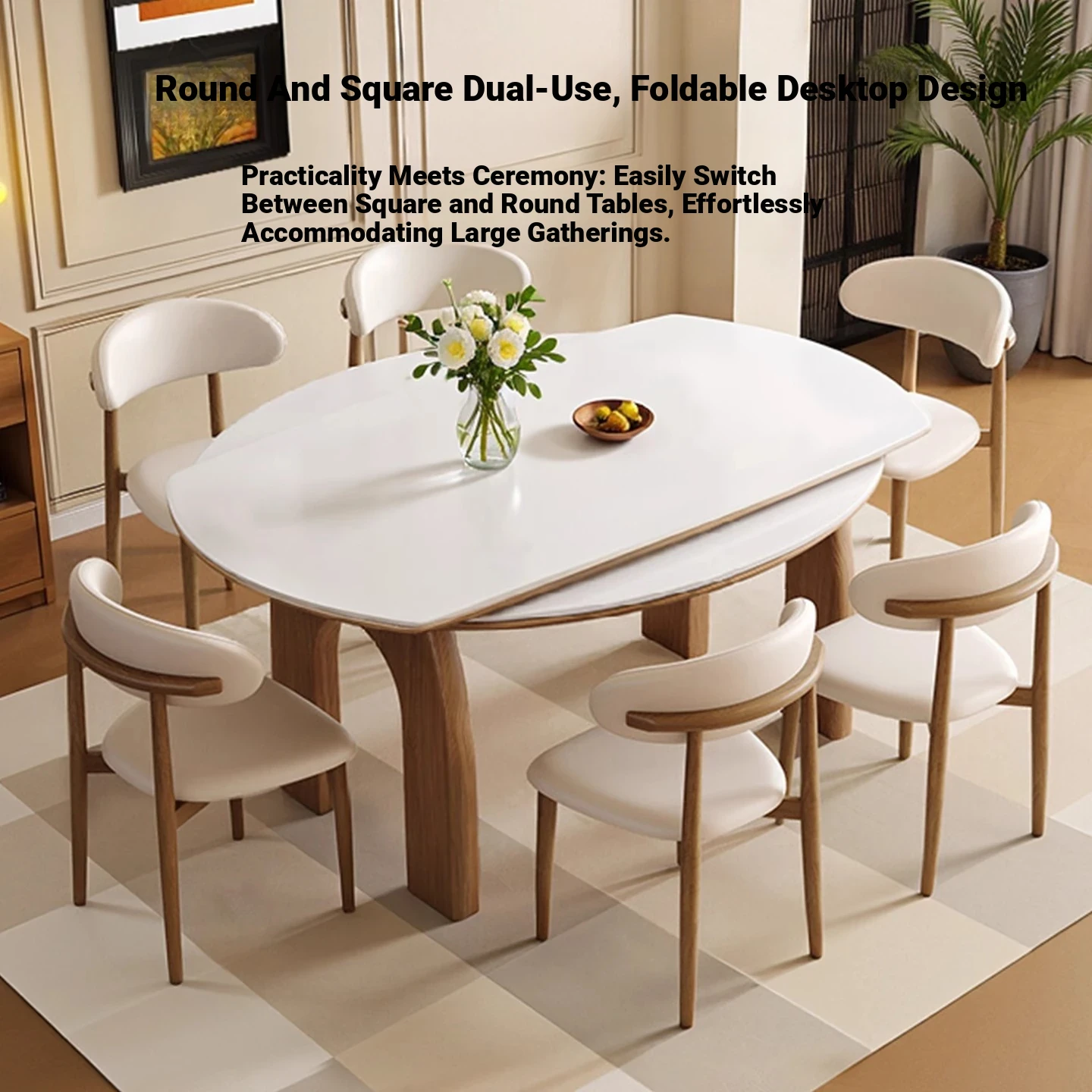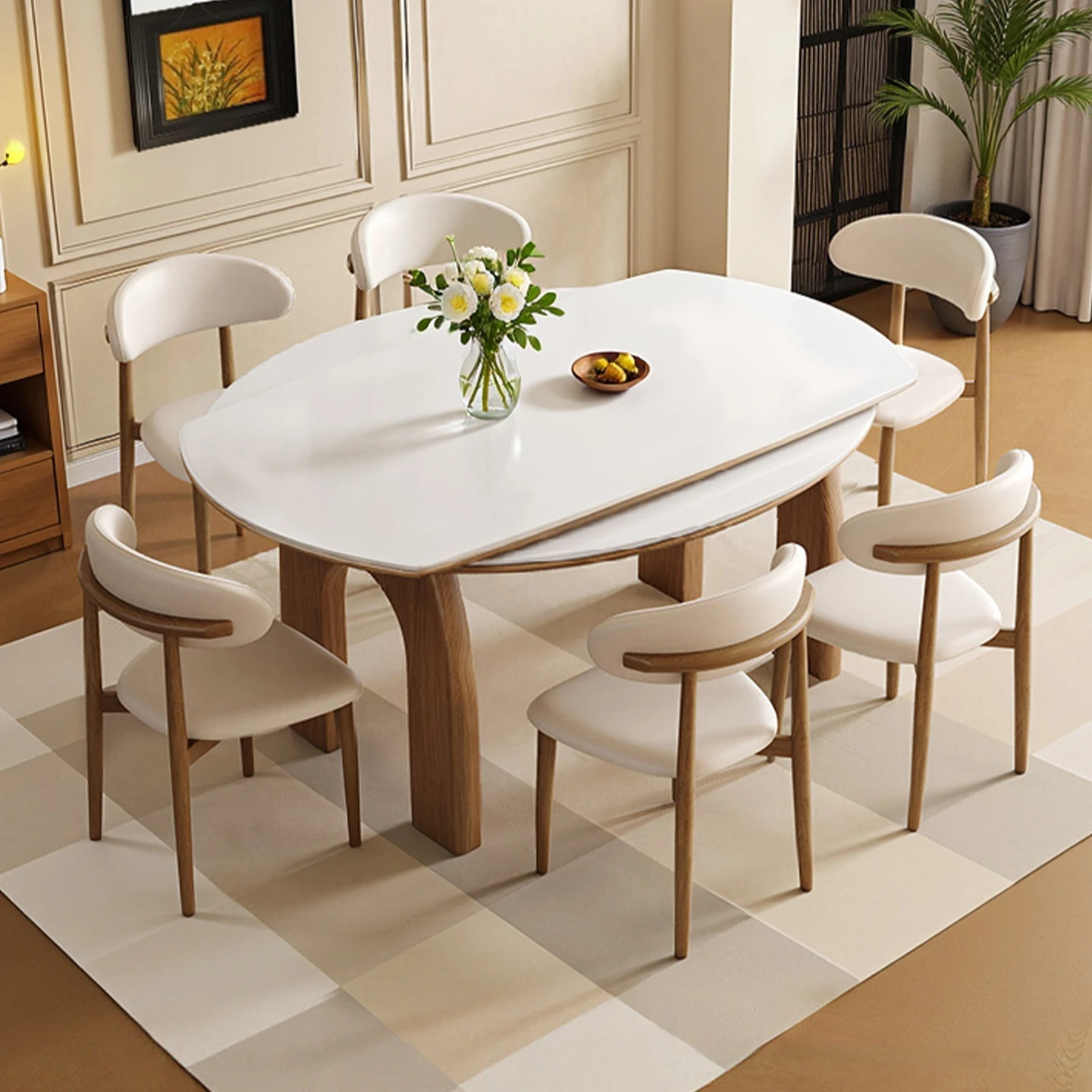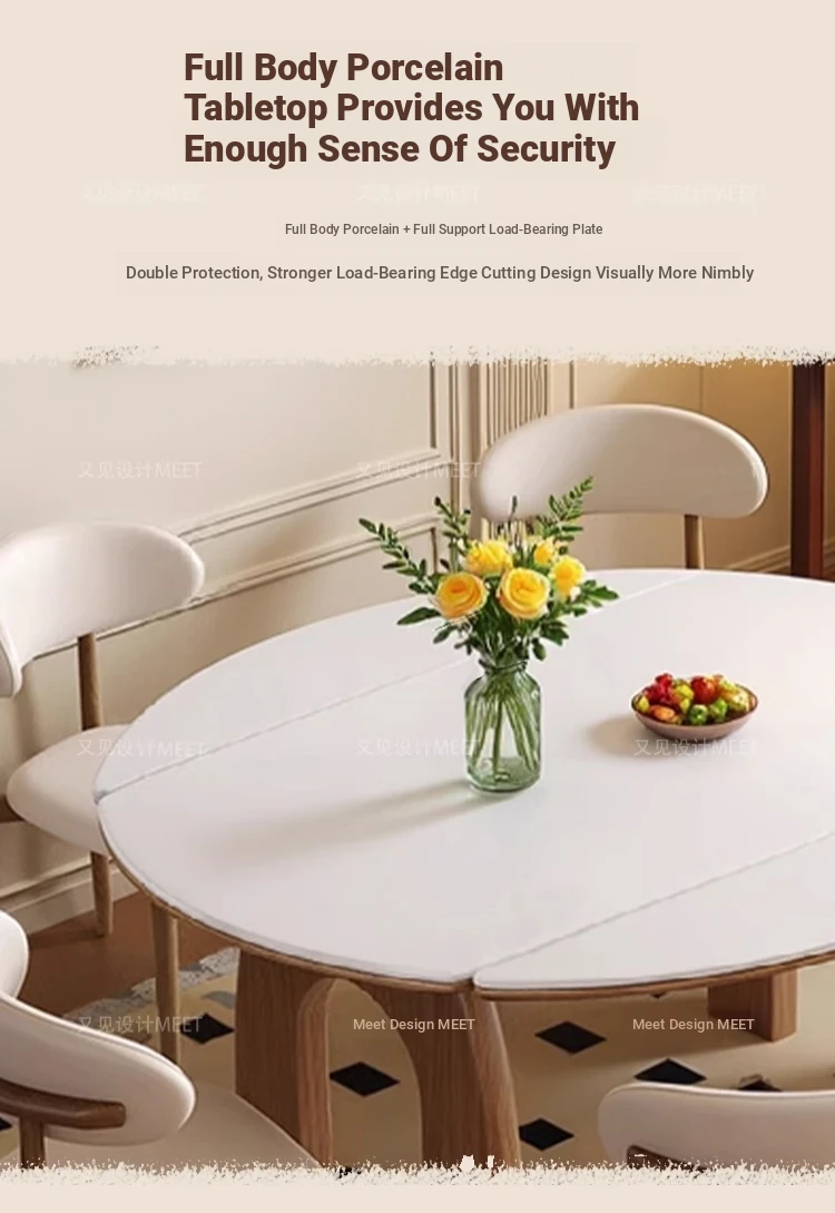 伸縮可能な無垢材ロックボードダイニングテーブルセット|フレンチヴィンテージ風|小型リビングに最適な調整可能な円形ダイニングテーブル