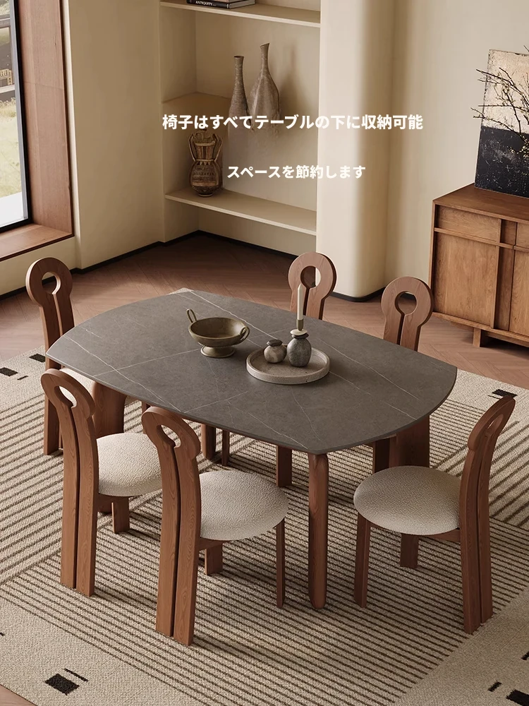 クリーム風洞石製岩板の実木ダイニングテーブル&チェアセット - 小型住居にもぴったり!フレンチスタイルの長方形テーブル、2025年新モデルでおしゃれな食卓を演出。