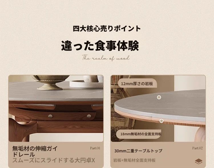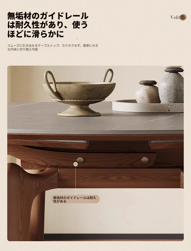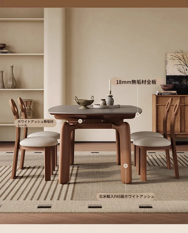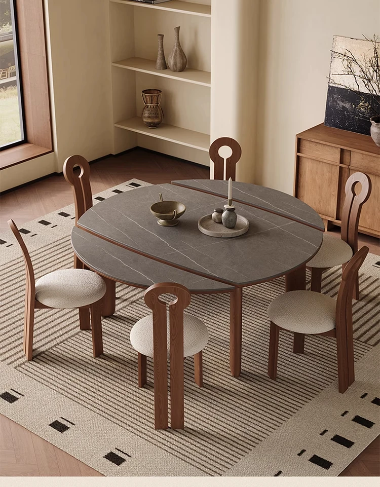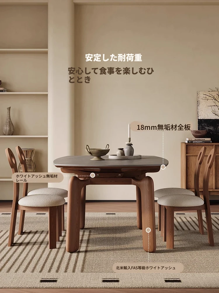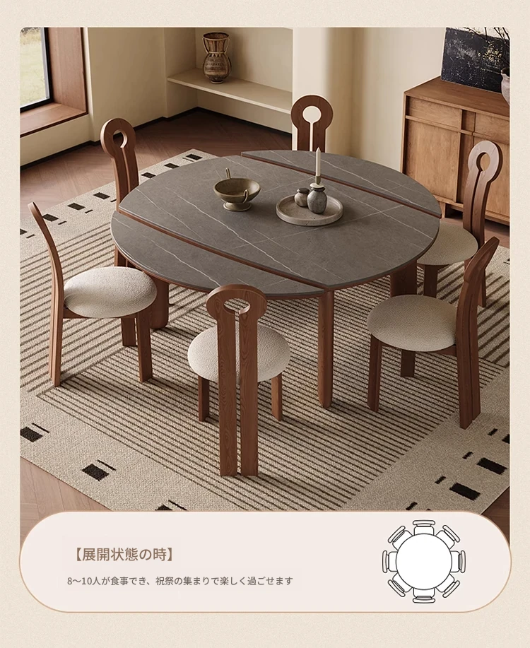 伸縮可能なモダンデザインの岩板ダイニングテーブル!小スペースに最適な2WAY丸型・四角型、実木製折りたたみテーブル。家族や友人との時間を楽しむための理想的な選択!