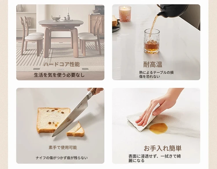 フレンチクリーム風の多機能折りたたみ式回転テーブル - 天然木と岩板製、四角から丸へ変形可能で伸縮自在。どんな空間にもぴったりフィットし、家族や友人との特別なひとときを演出します!