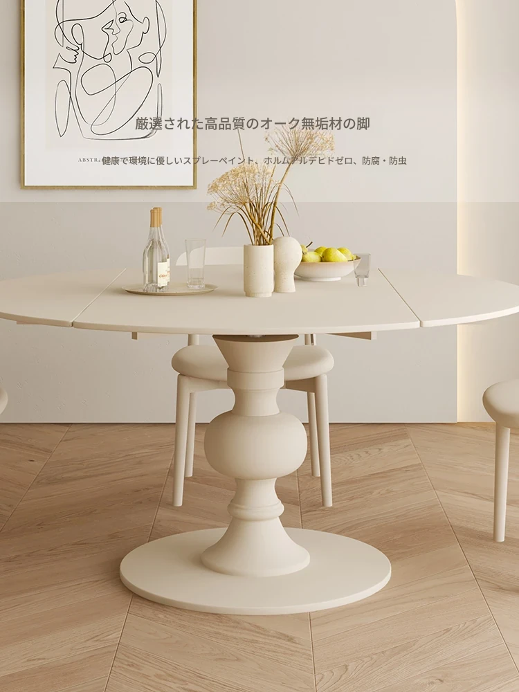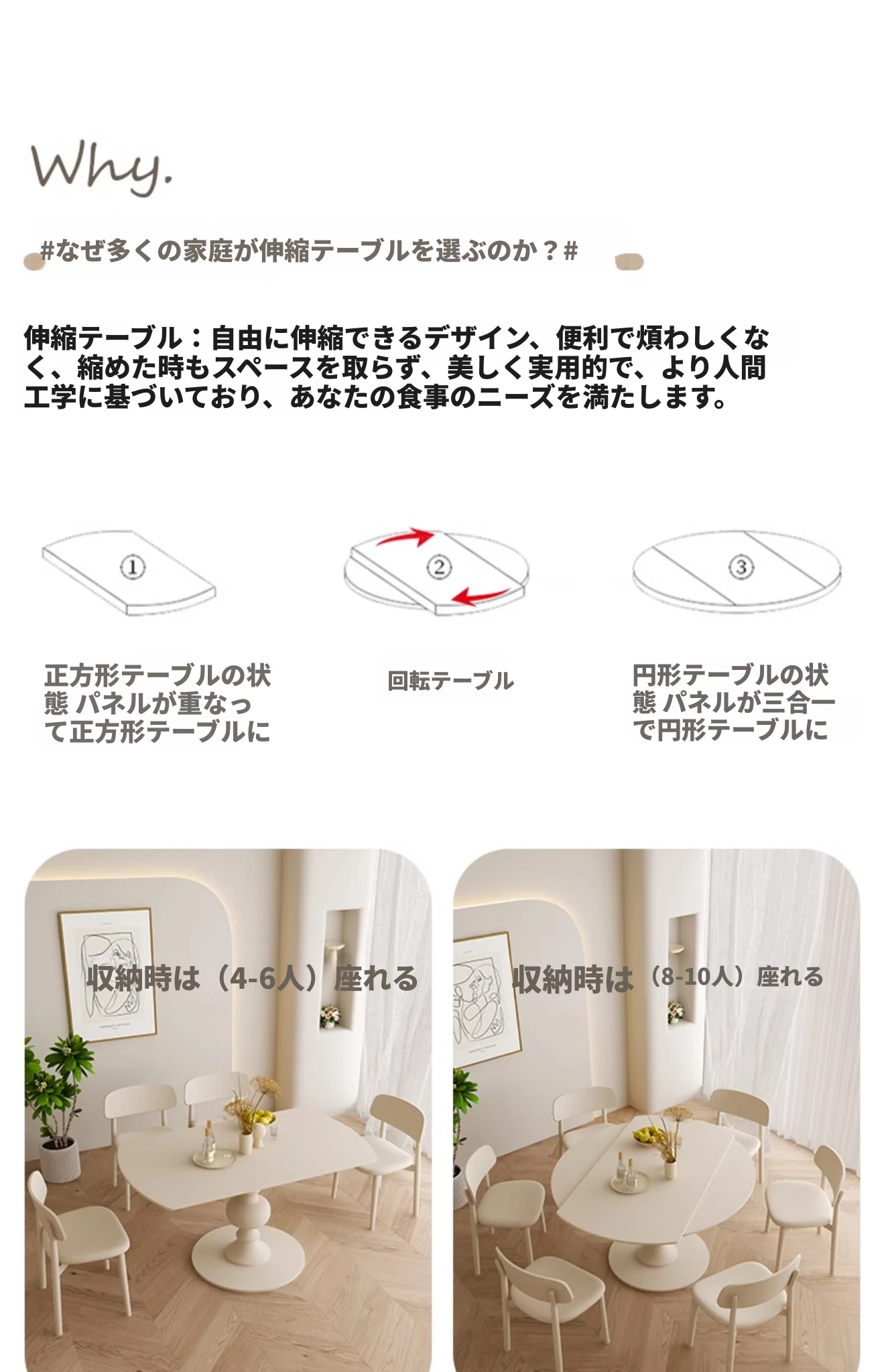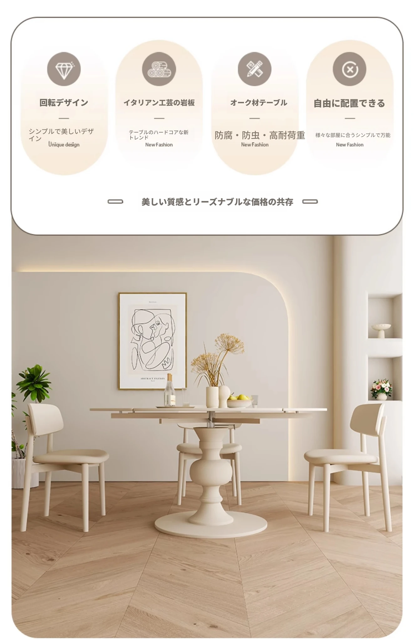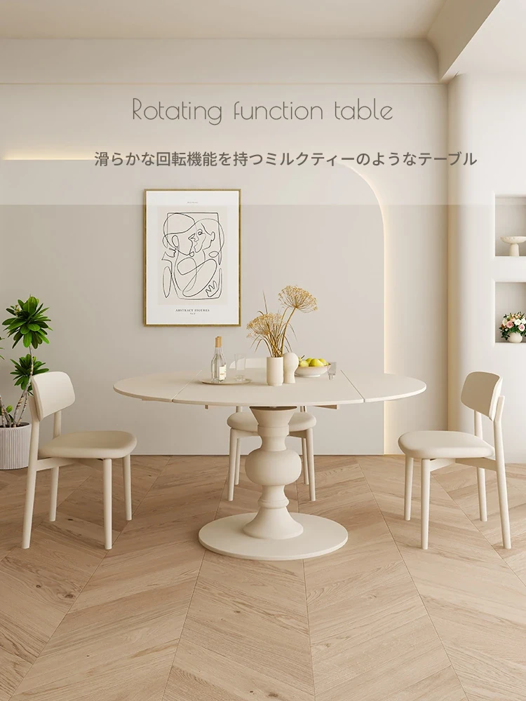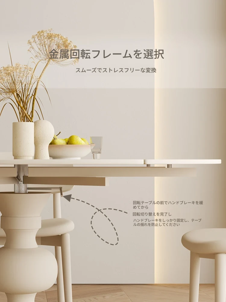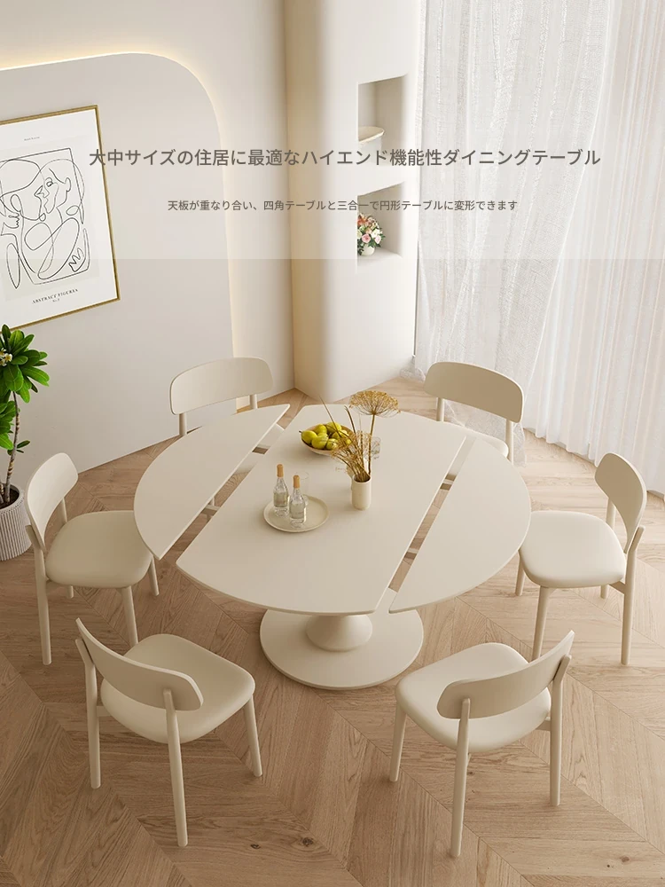 フレンチクリーム風の多機能折りたたみ式回転テーブル - 天然木と岩板製、四角から丸へ変形可能で伸縮自在。どんな空間にもぴったりフィットし、家族や友人との特別なひとときを演出します!