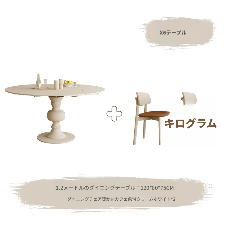 【新温旋转餐桌】1.2メートル+6椅子クリーム色
