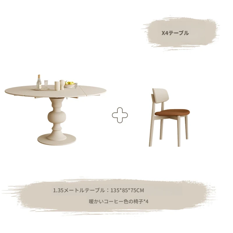 【新温旋转餐桌】1.35メートル+4椅子クリーム色
