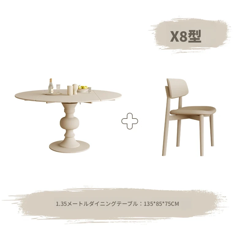 【新温旋转餐桌】1.35メートル+8椅子クリーム色