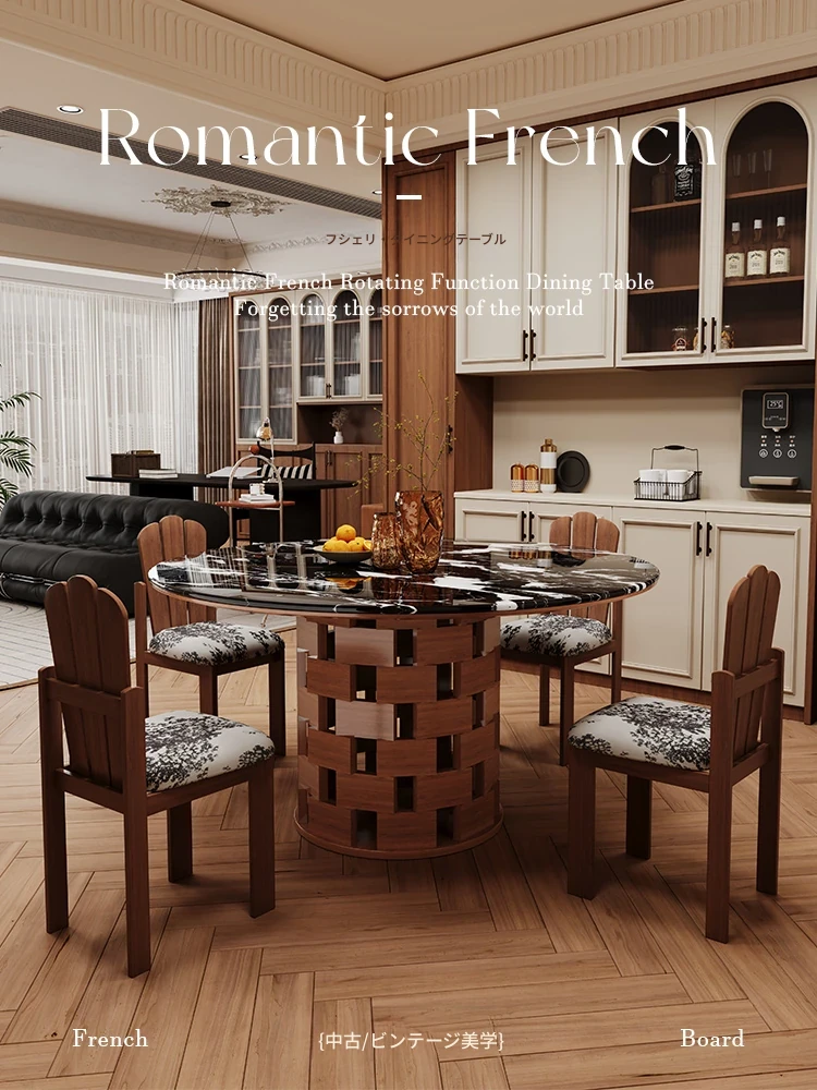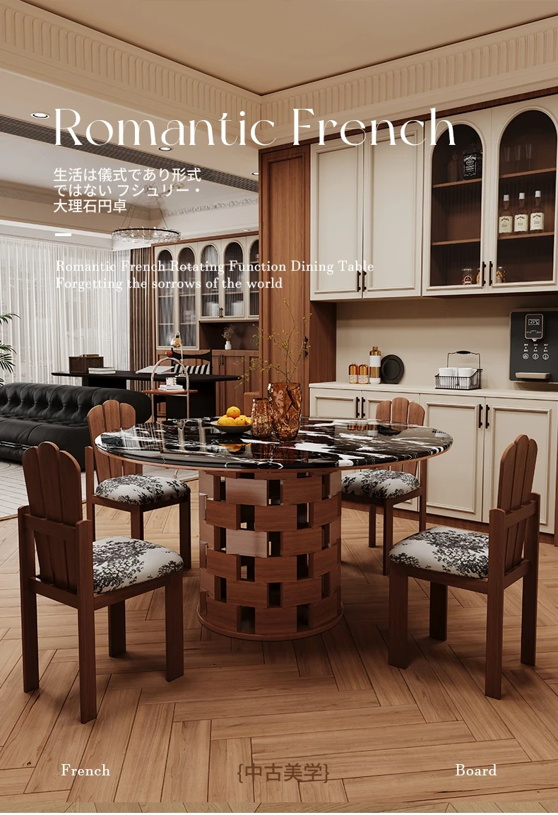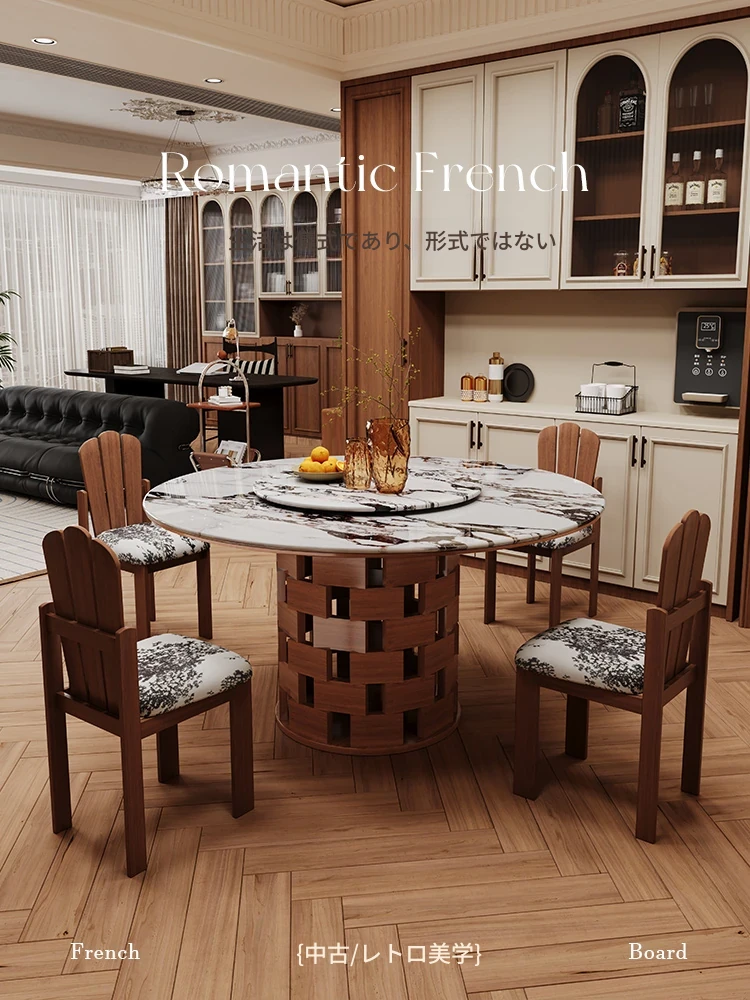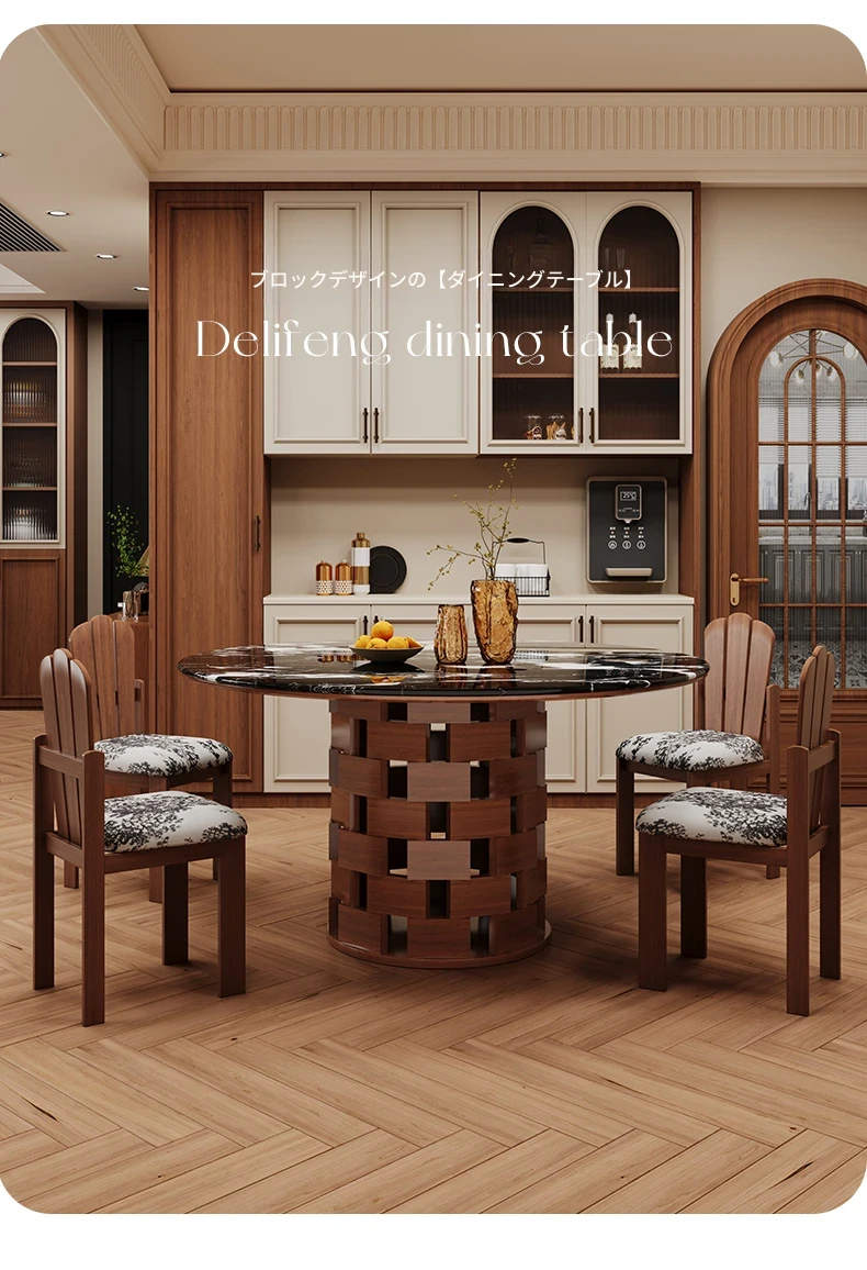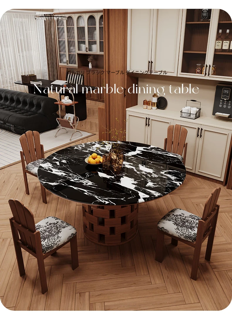 フランス風ヴィンテージ・ブルガリ黒大理石ラウンドダイニングテーブル - 高級感あふれる実木製のレトロスタイル、あなたの家に上質な食卓を。