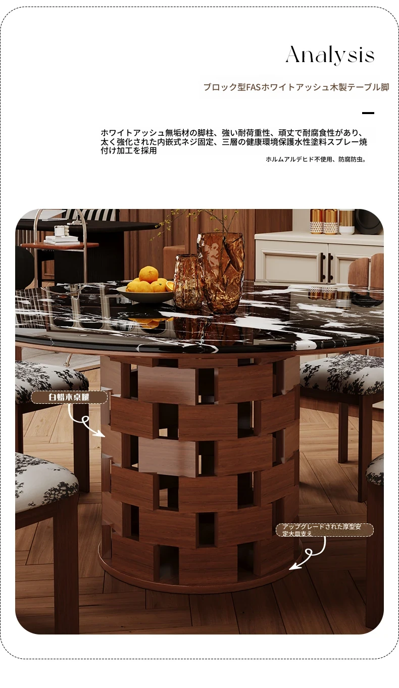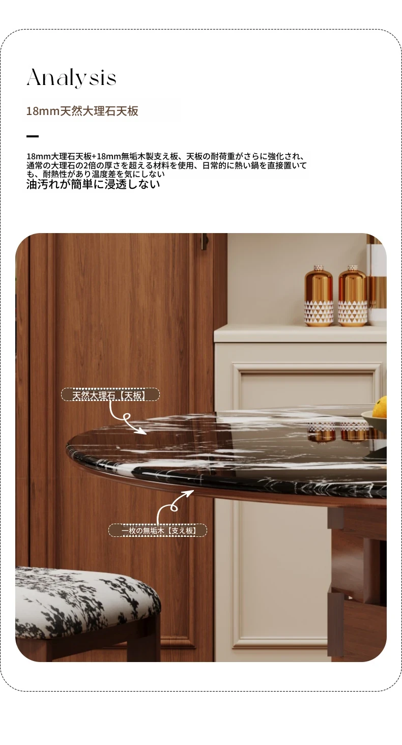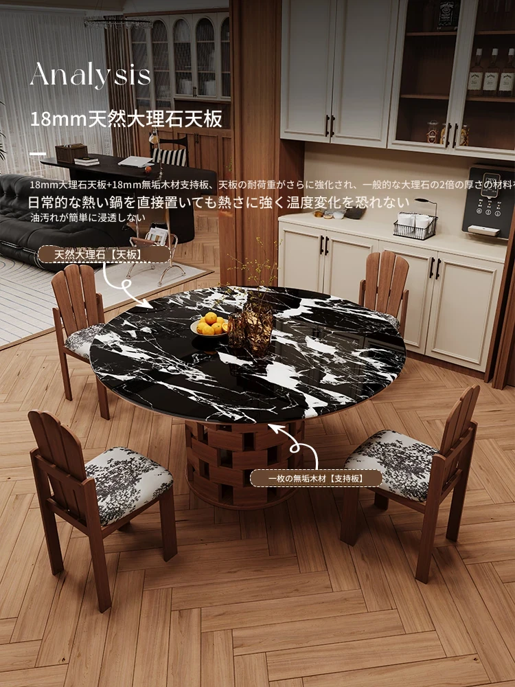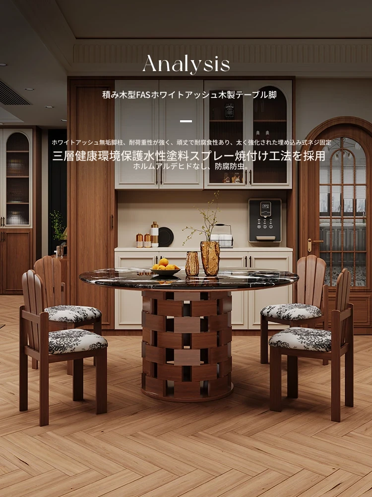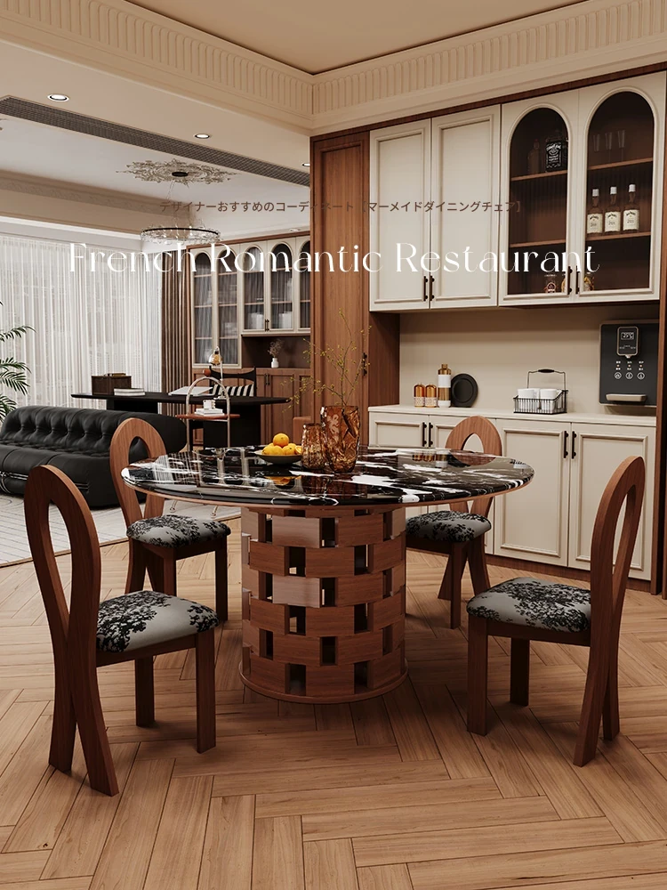 フランス風ヴィンテージ・ブルガリ黒大理石ラウンドダイニングテーブル - 高級感あふれる実木製のレトロスタイル、あなたの家に上質な食卓を。