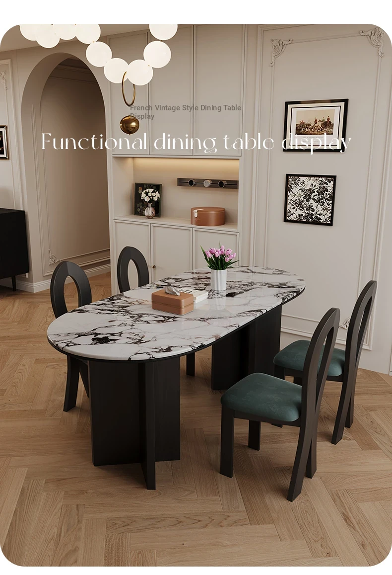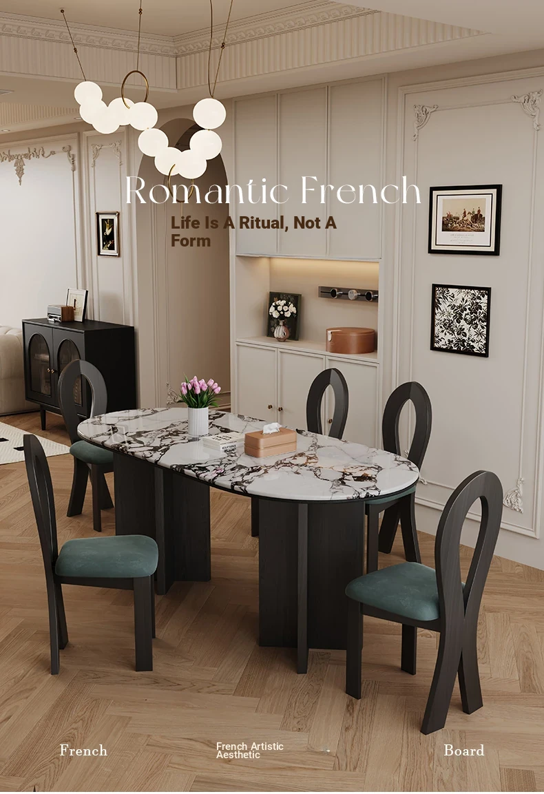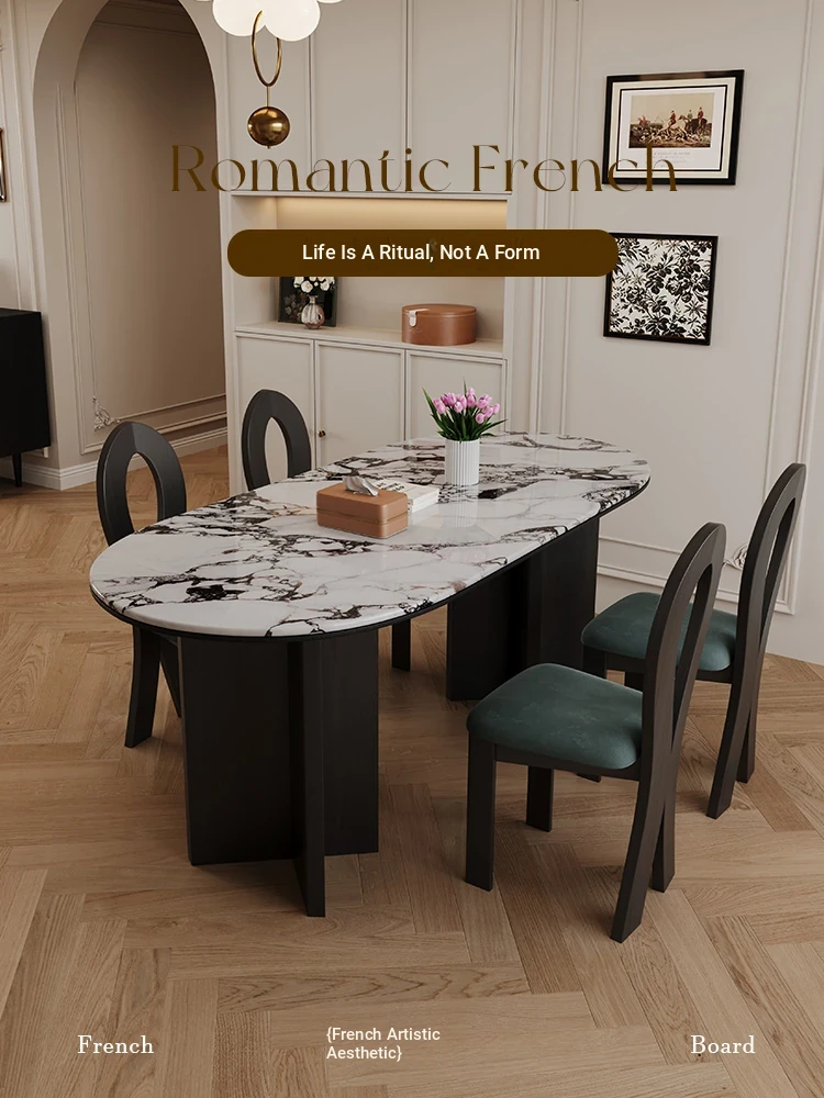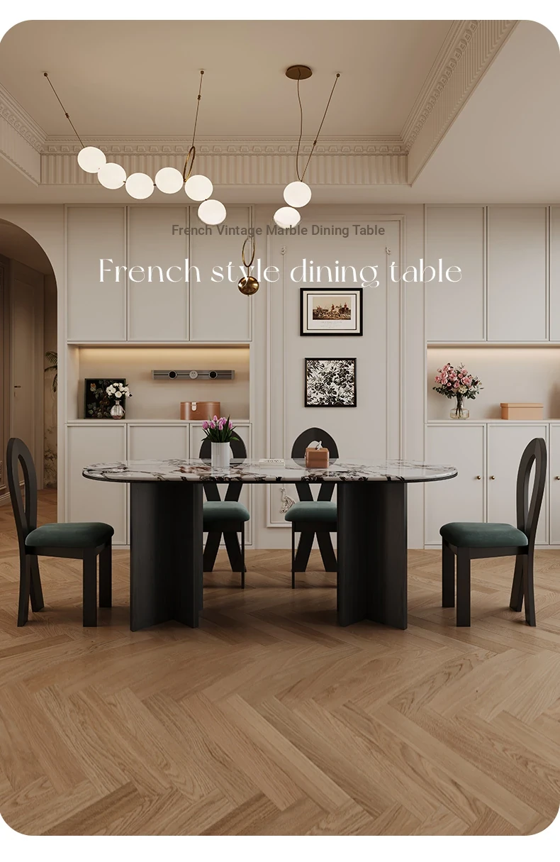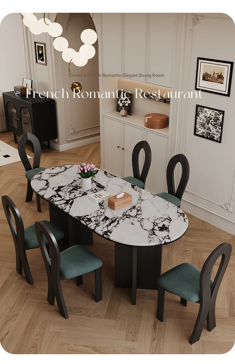 French Vintage Style Bvlgari Natural Marble Dining Table Set - Oval Solid Wood Dining Table and Chair Combo for Small Spaces, Perfect for Home Use