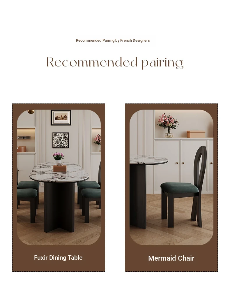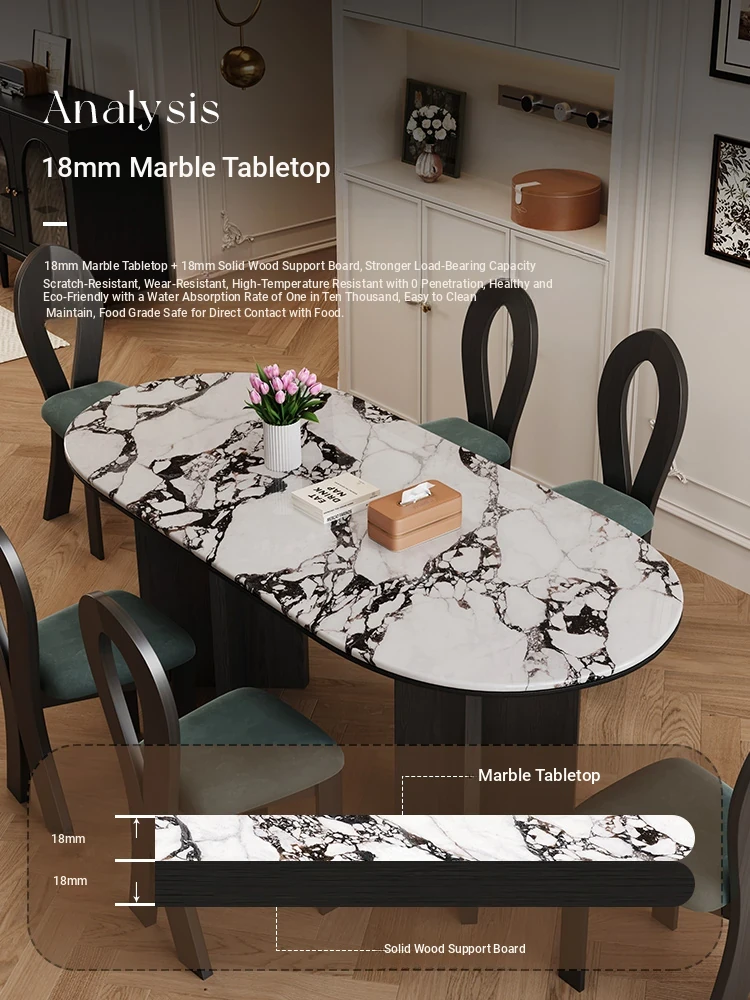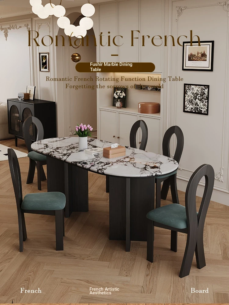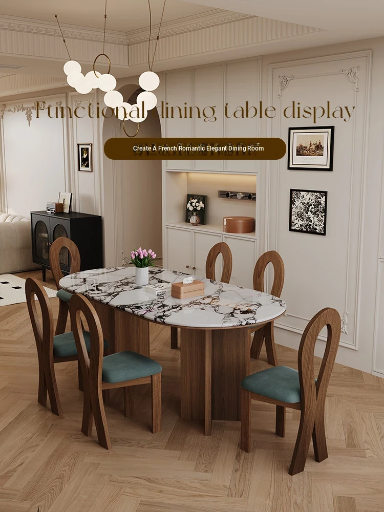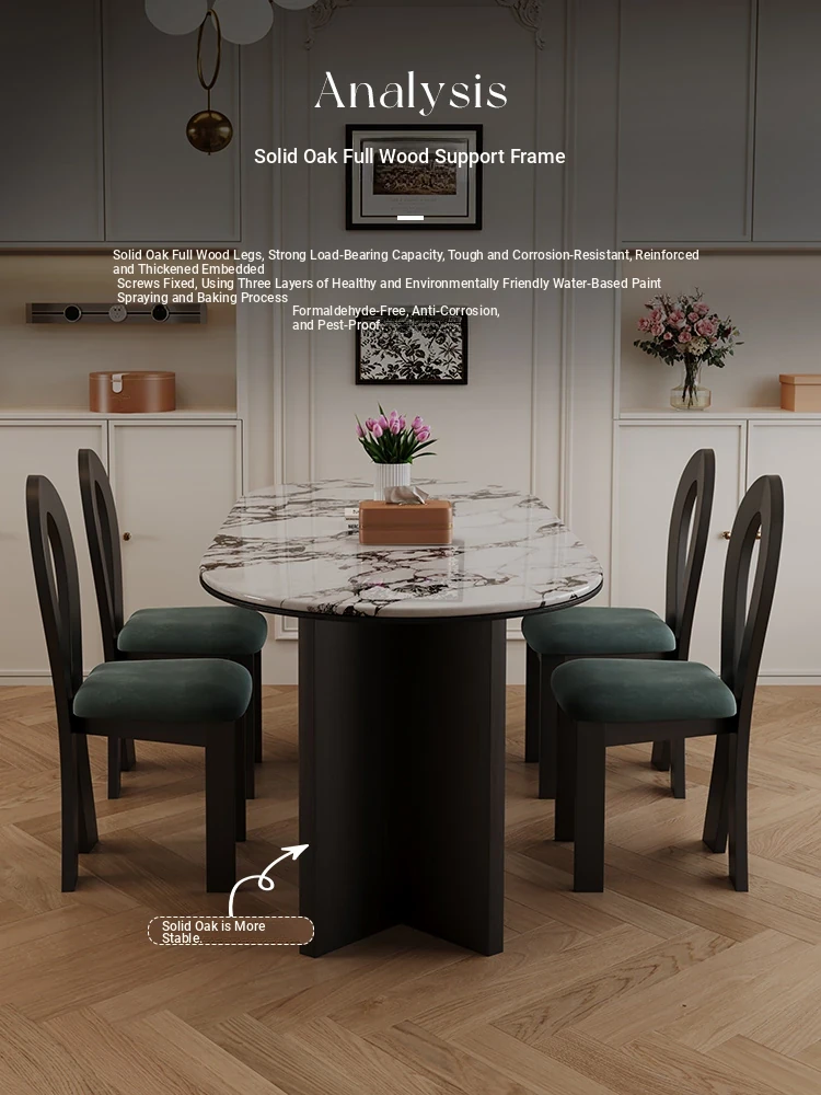 French Vintage Style Bvlgari Natural Marble Dining Table Set - Oval Solid Wood Dining Table and Chair Combo for Small Spaces, Perfect for Home Use