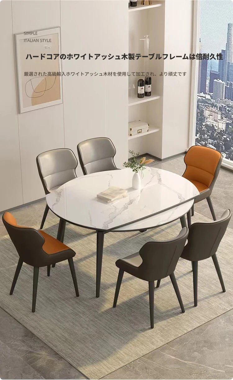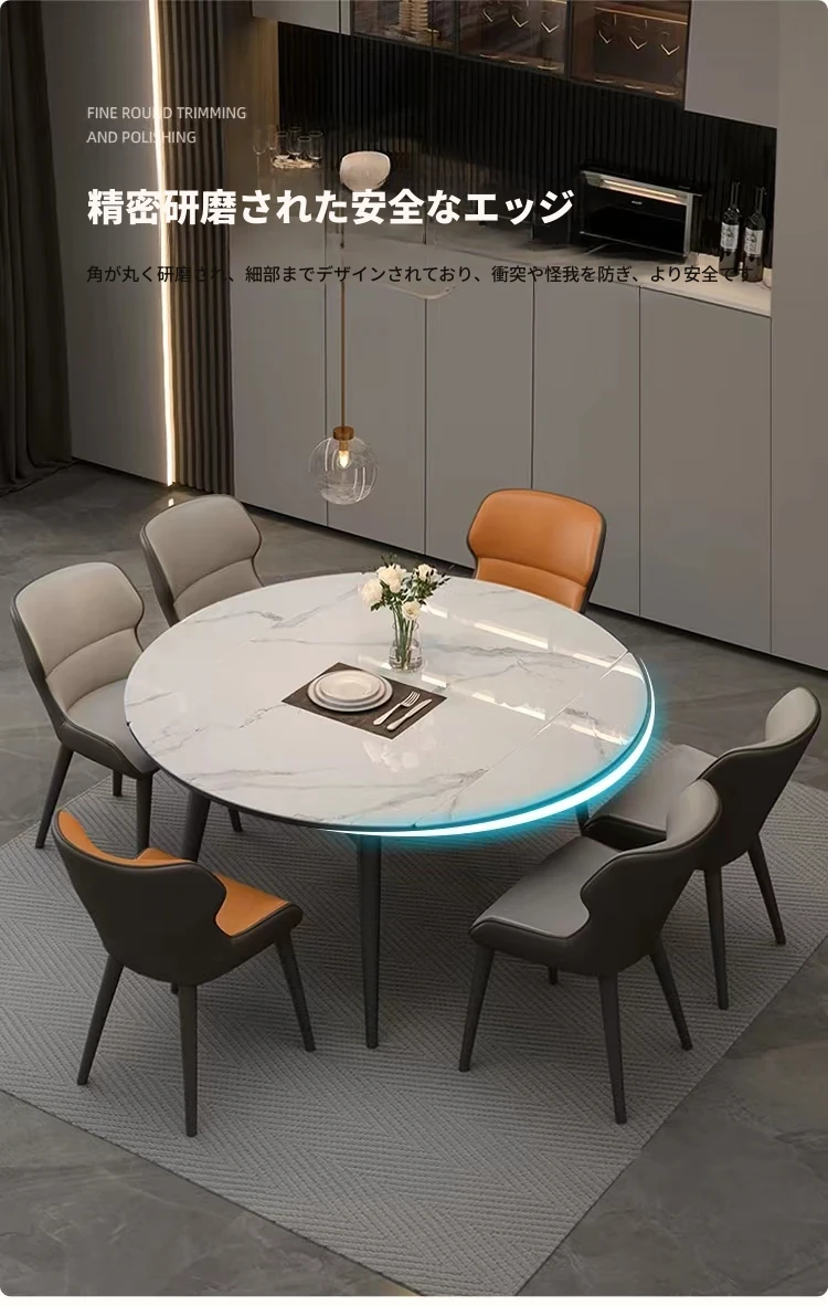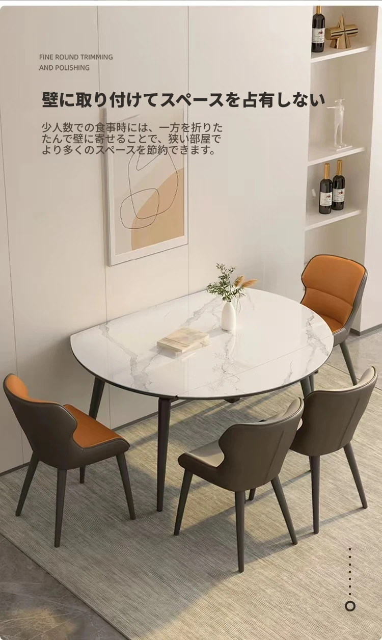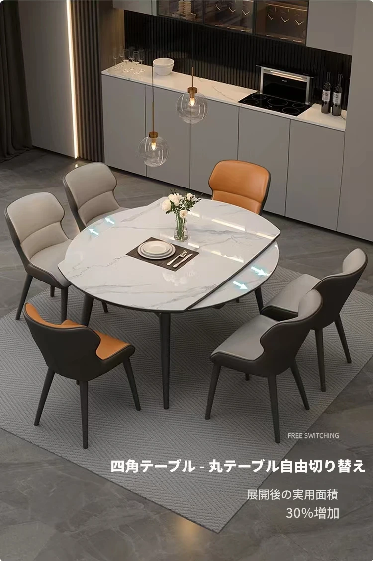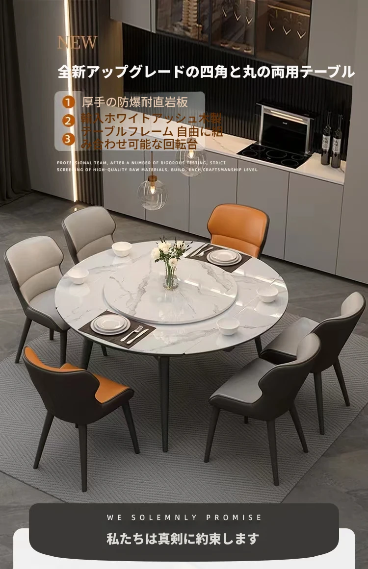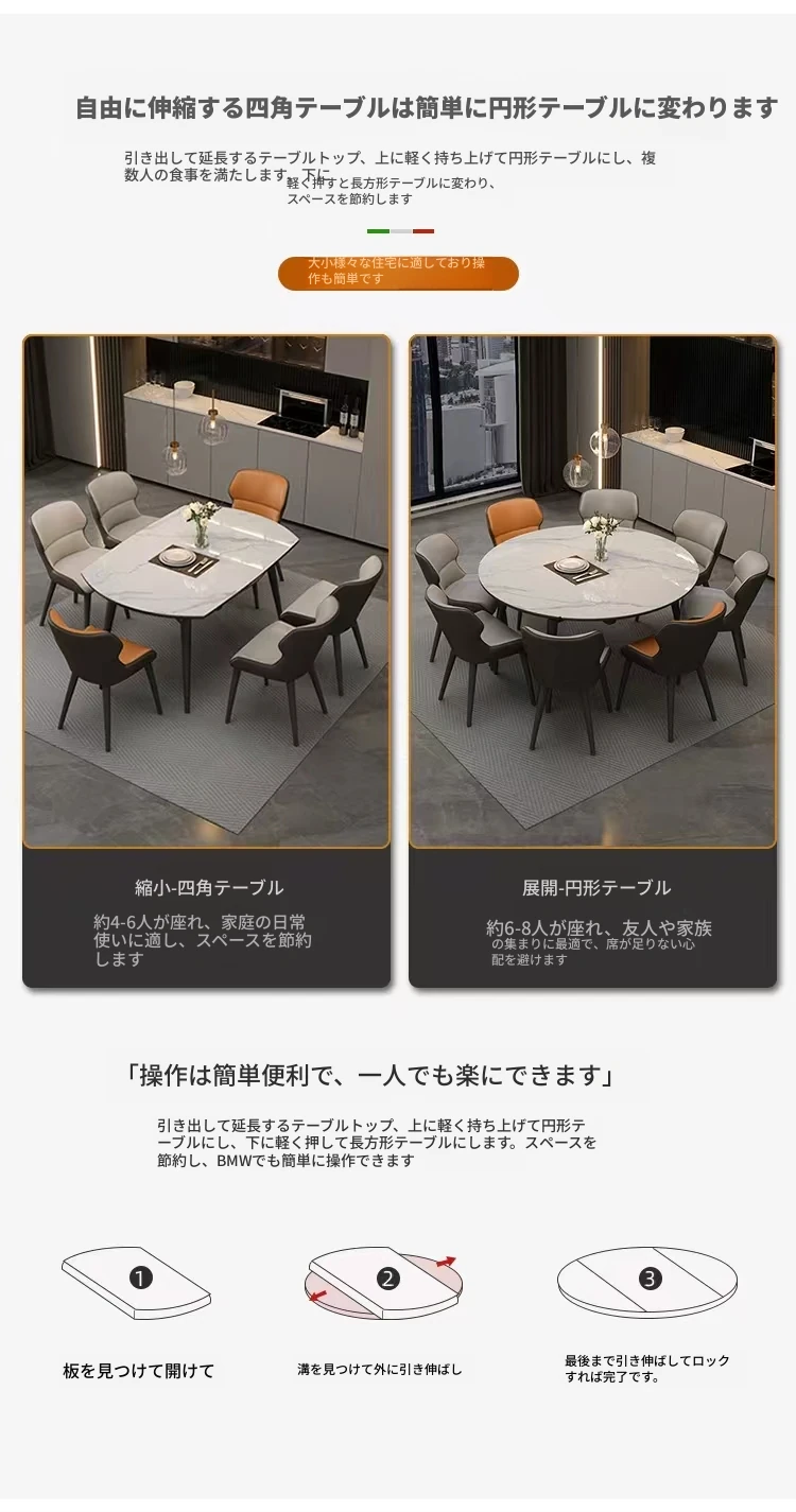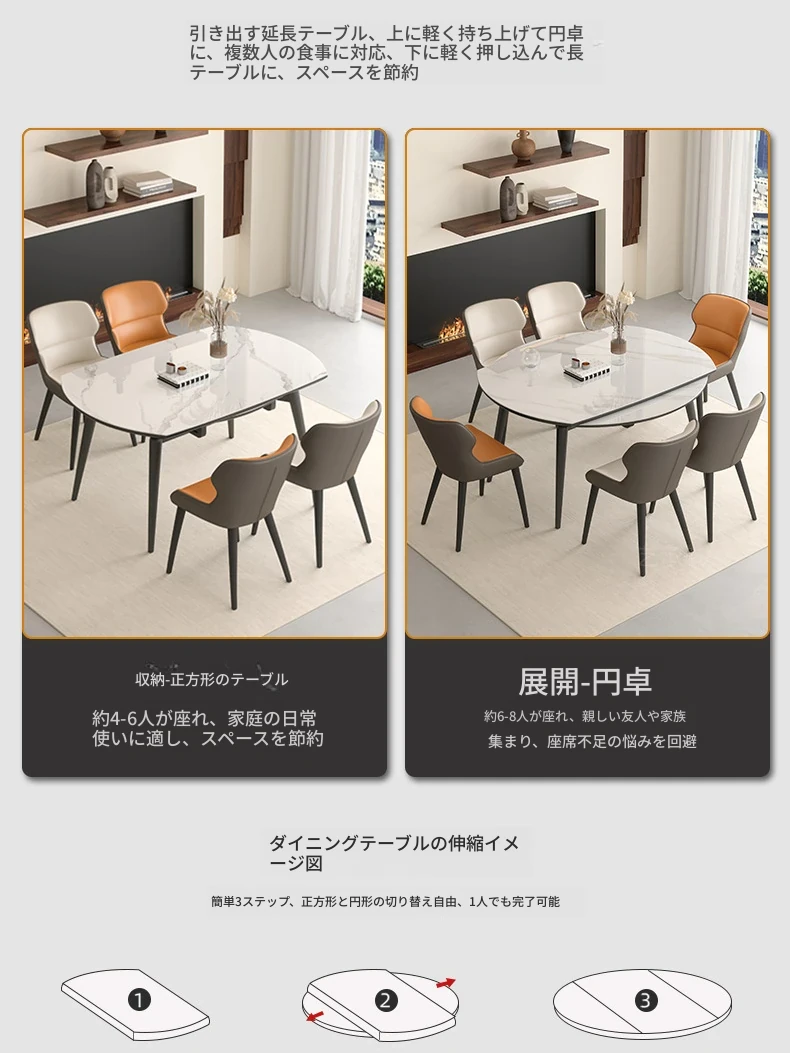 伸縮可能なモダンデザインの実木製岩板ダイニングテーブル - 小型住居に最適な軽奢華なシンプルスタイル、丸型と四角型の2WAYデザインで、使い勝手抜群の食卓です!