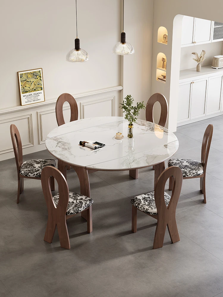 中古風スタイルの伸縮式実木ダイニングテーブル - 丸型にも変形可能!小さなお部屋にぴったりな、洞石岩板使用の高品質な食卓。おしゃれで機能的な空間を演出!