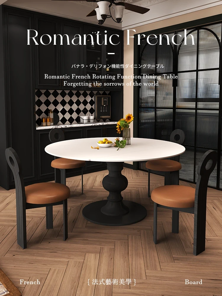 フレンチアンティークスタイルの伸縮式ロックボードダイニングテーブルセット - 小スペースに最適!実木製の丸テーブルで、家族や友人との食事を楽しむための理想的な選択。