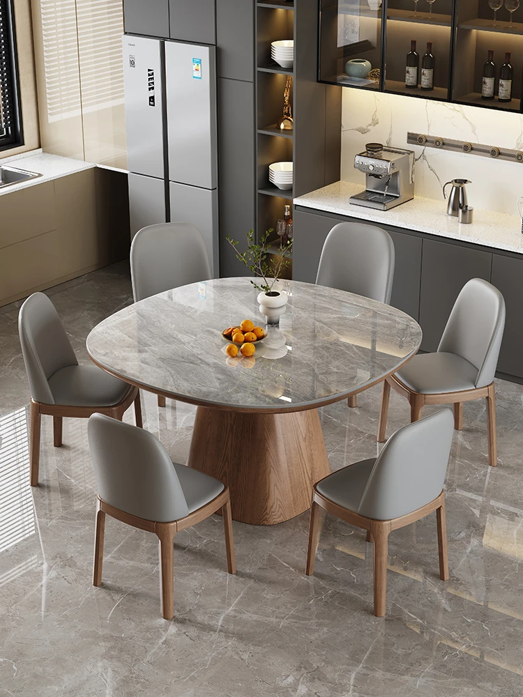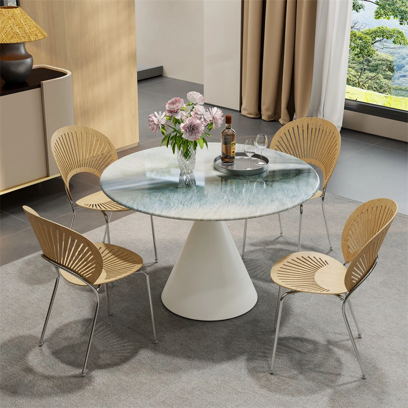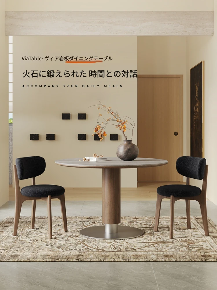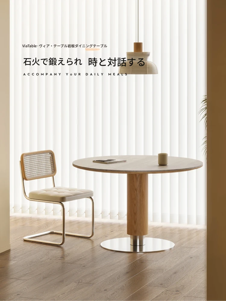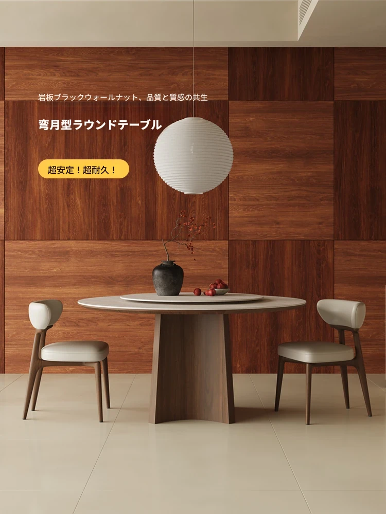 オーロマ|洞石岩板円形ダイニングテーブル 家庭用小型食堂に最適 デザイナーズテーブル 天然木材使用の上質な円卓で、心地よい食事のひとときを演出します。